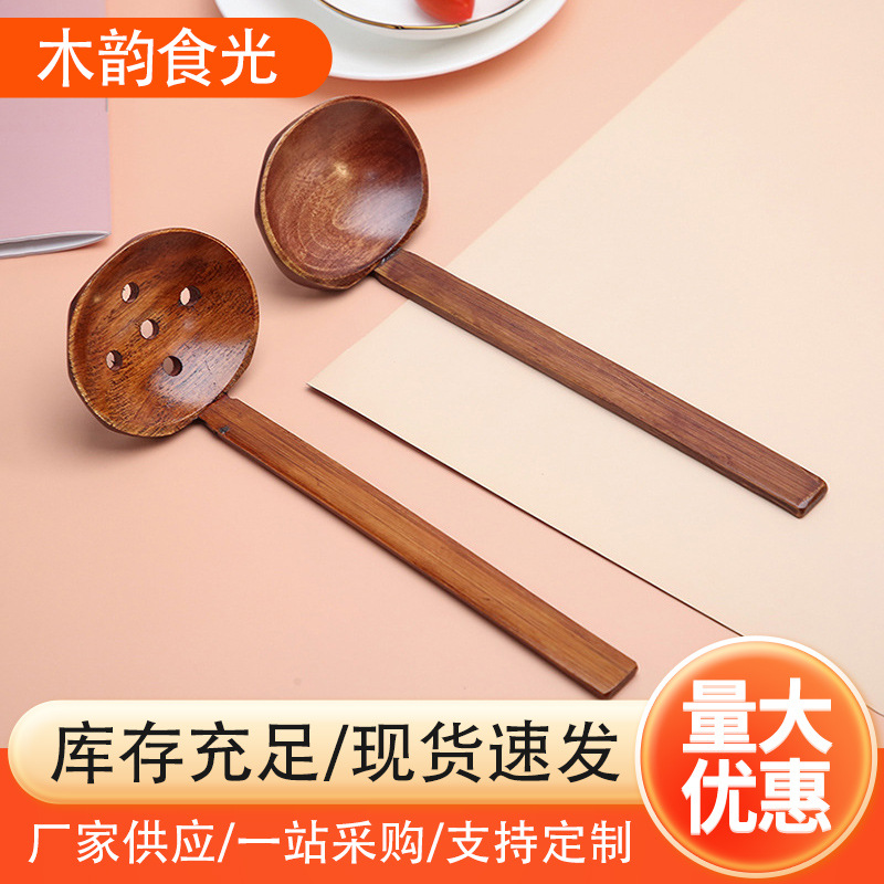 日式创意楠木长捞勺长柄龟甲纹火锅漏勺家用木质餐具拉面汤勺批发
