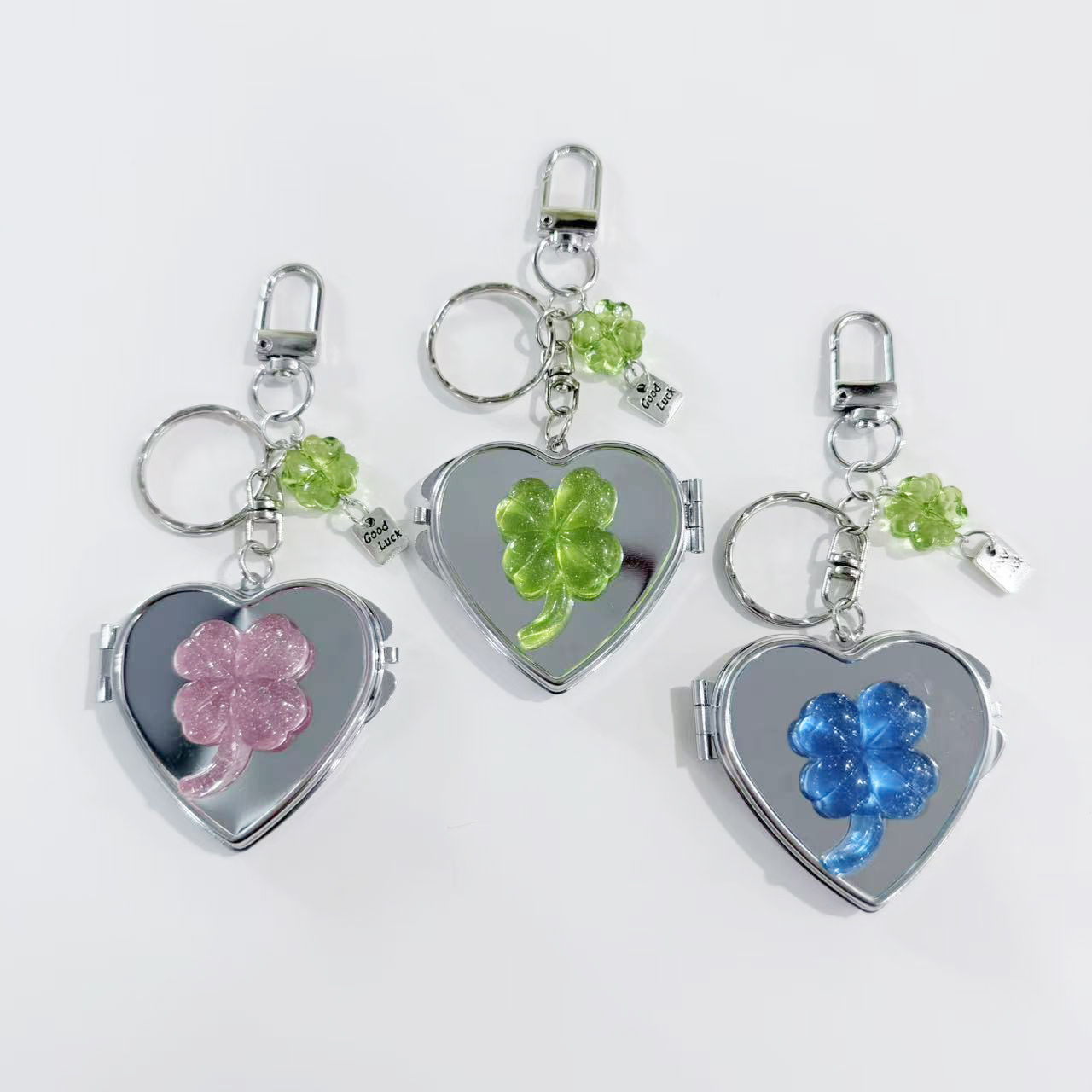 ins精致百搭田园风多色细闪四叶草可打开爱心镜子钥匙扣包包挂件