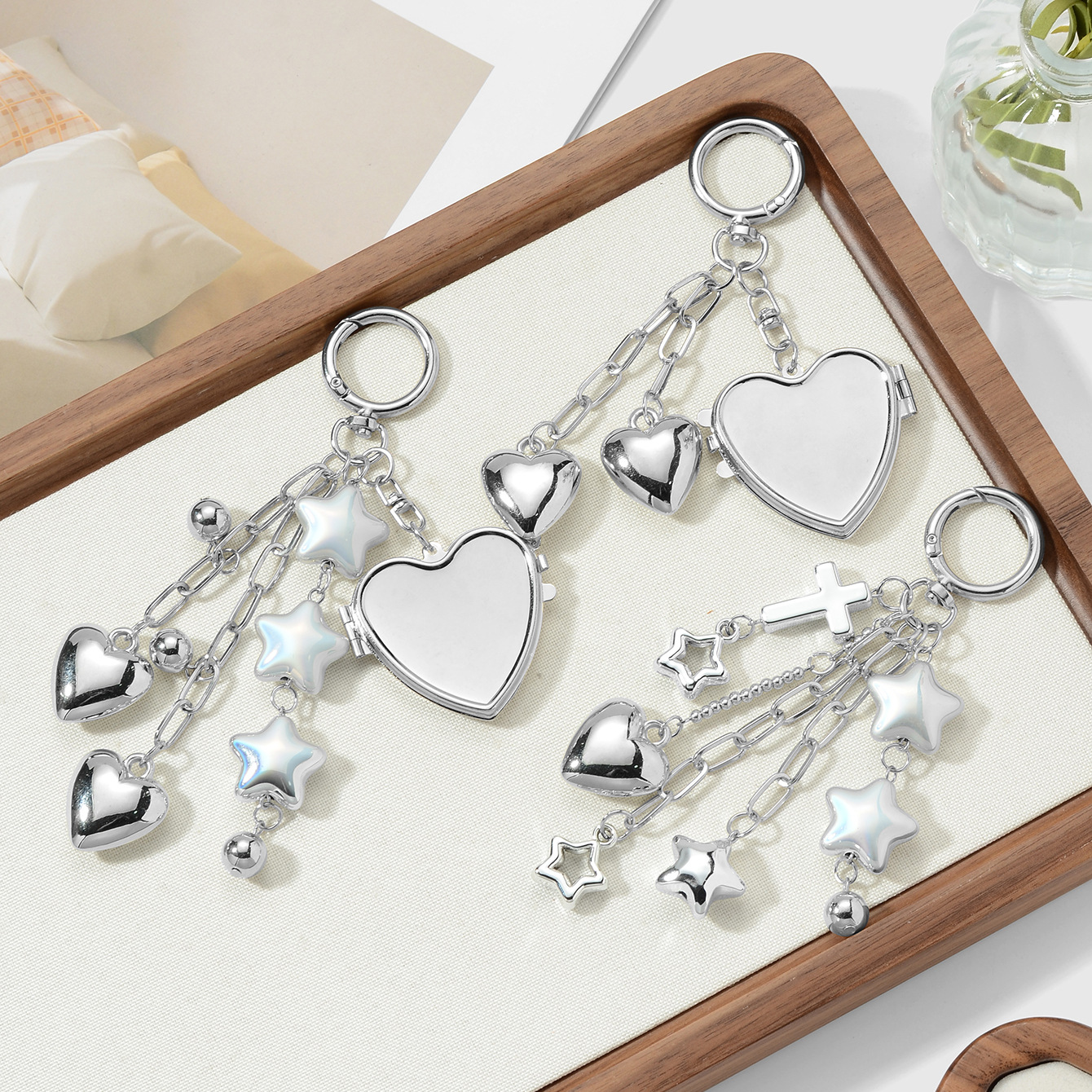 新款y2k创意精致时尚银色CCB爱心星星可打开玻璃镜子DIY钥匙扣