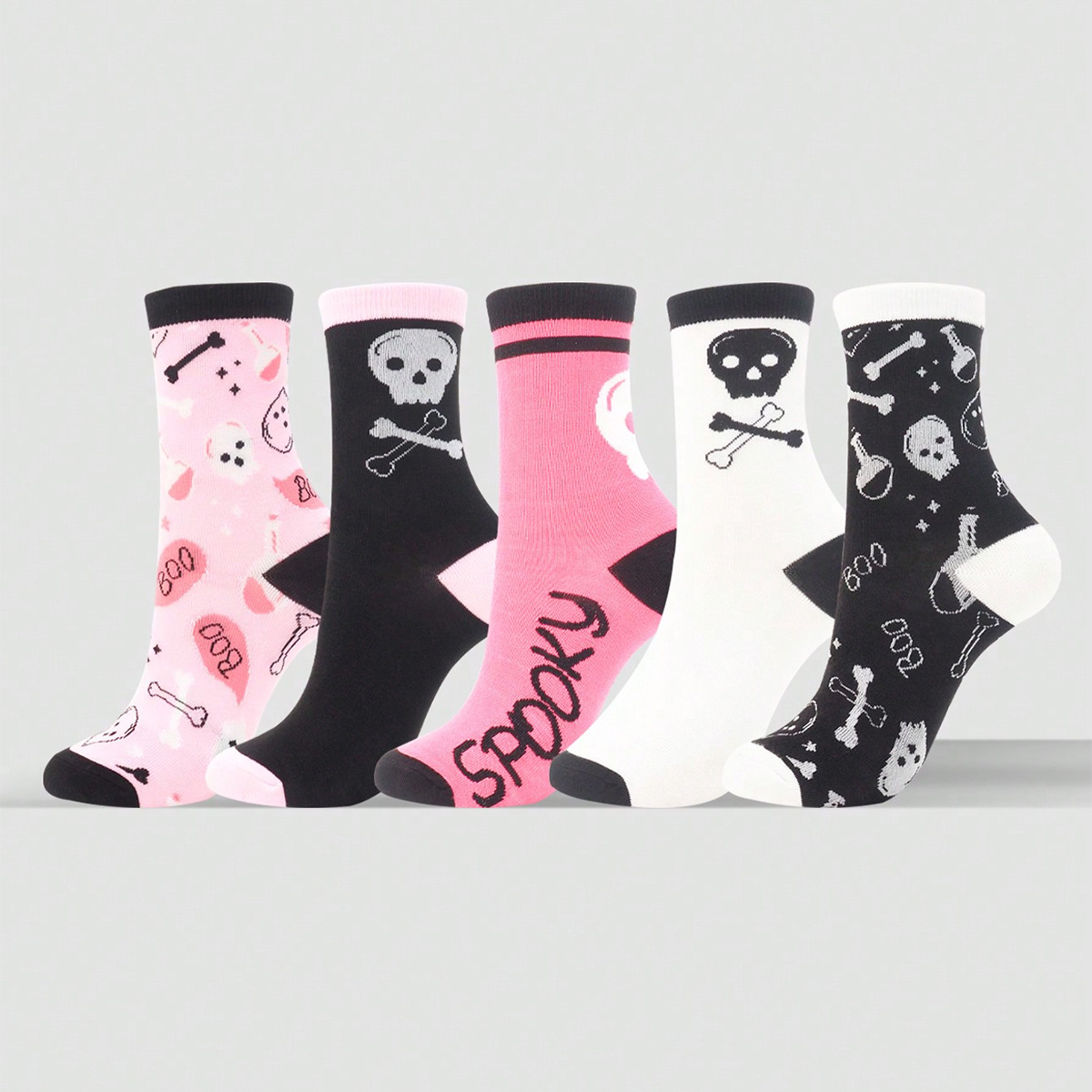 秋冬の女性用ストレート黒白ソックス、韓国風のかわいいスカル柄、ヒール付き、多用途な女性用ソックス、トレンドのホットスタイル
