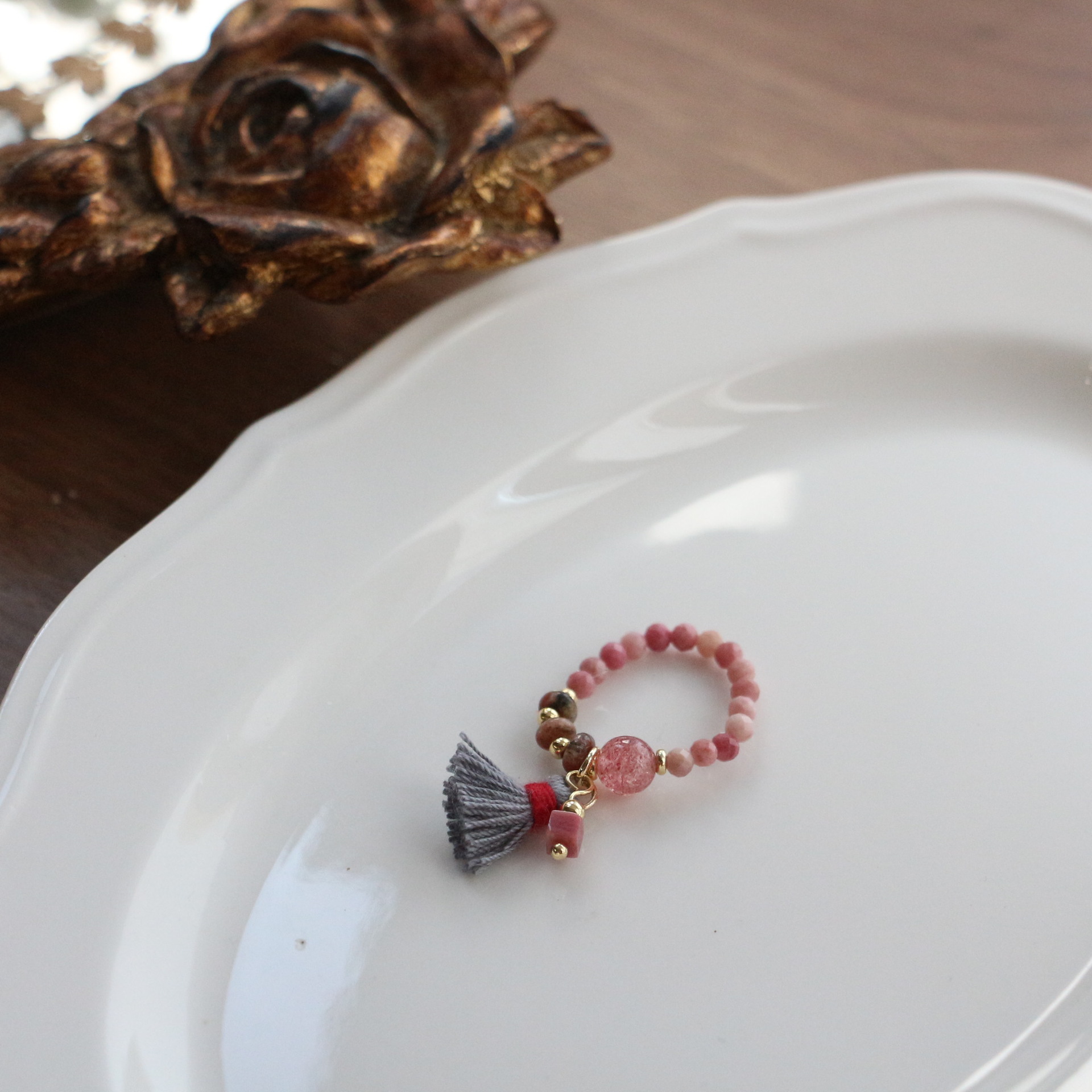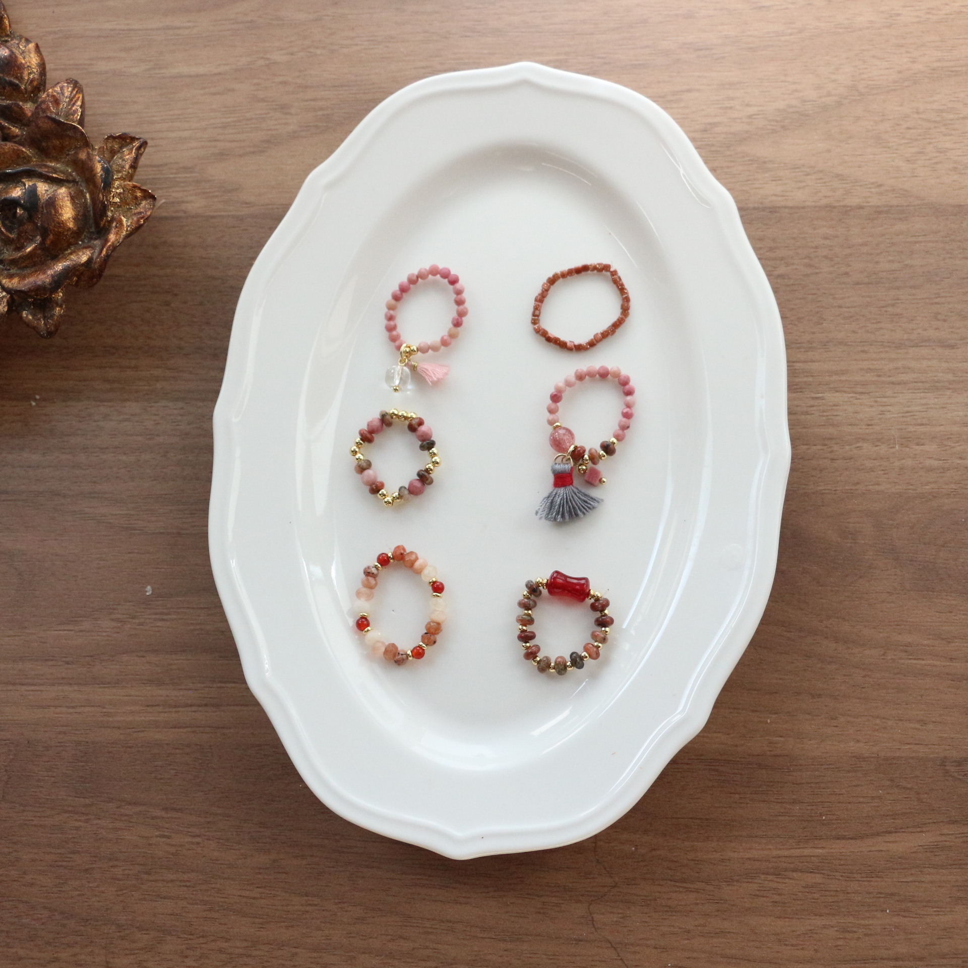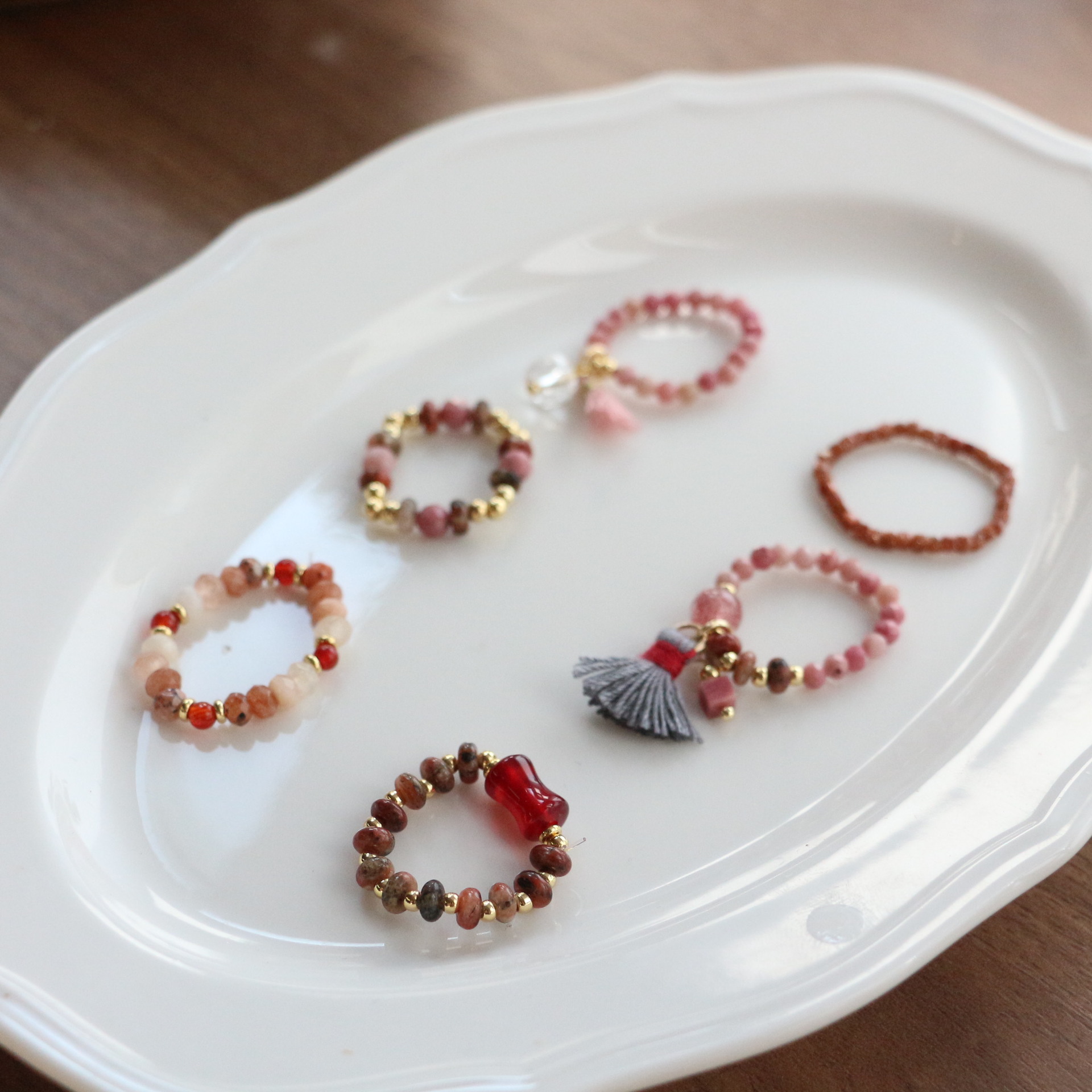 ホワイトクリスタルロードライトタッセルリング,赤瑪瑙ロードクロサイトリング,マルチカラーの天然石リング,ロードクロサイトリング,ストロベリークリスタルタッセルリング,レッドクォーツサンドリング,国産ライスビーズカラーリング,油絵石リング