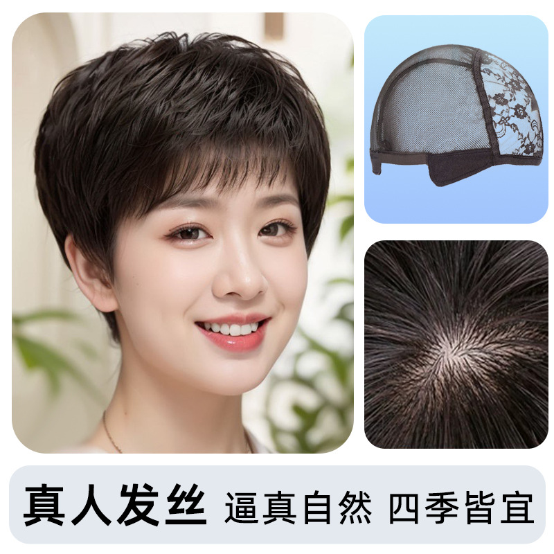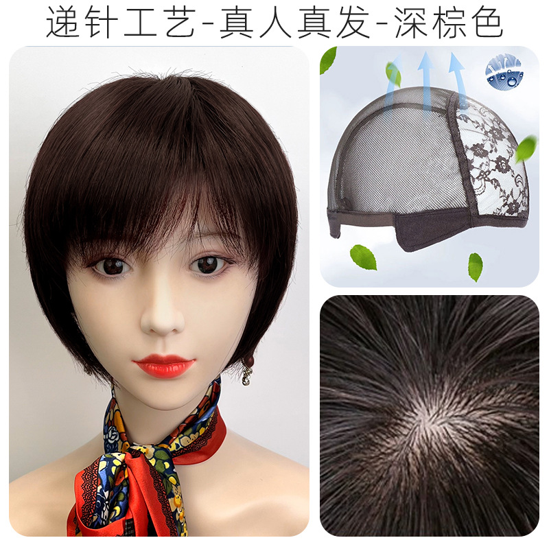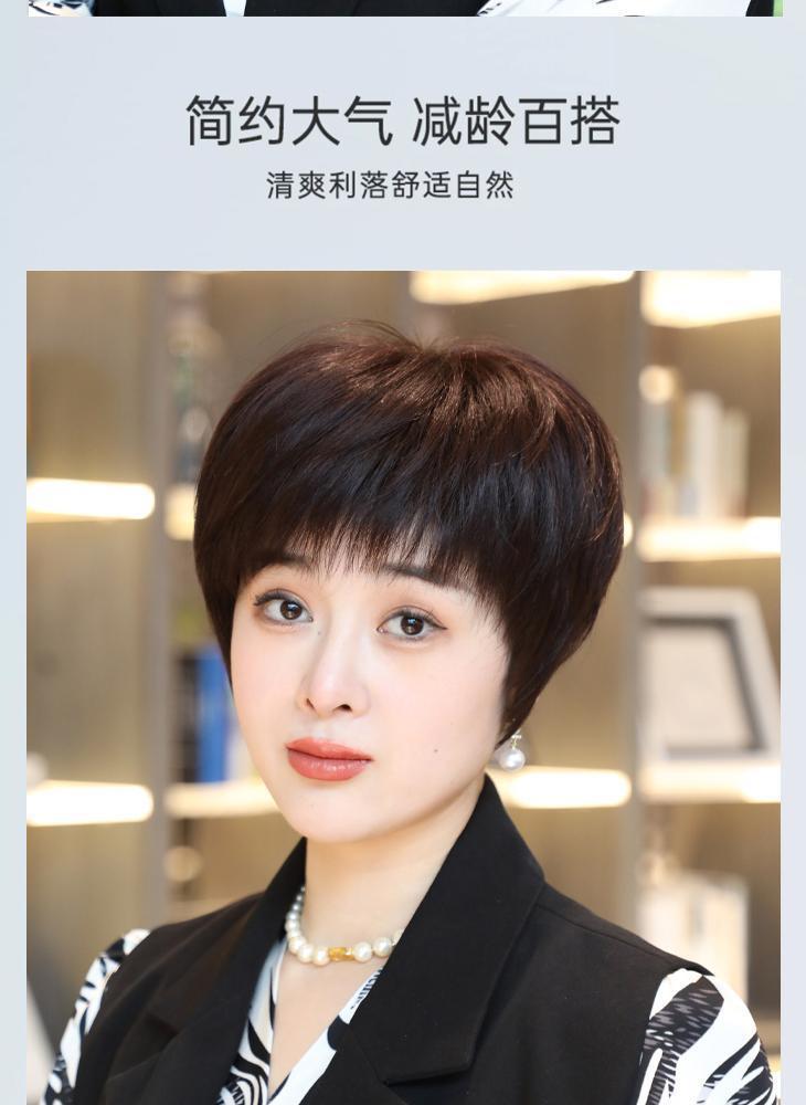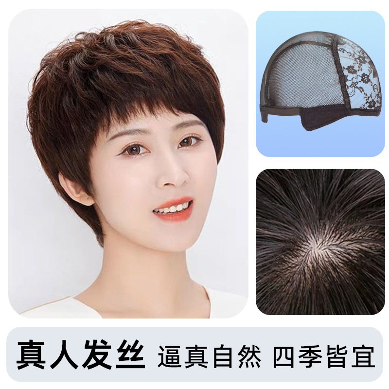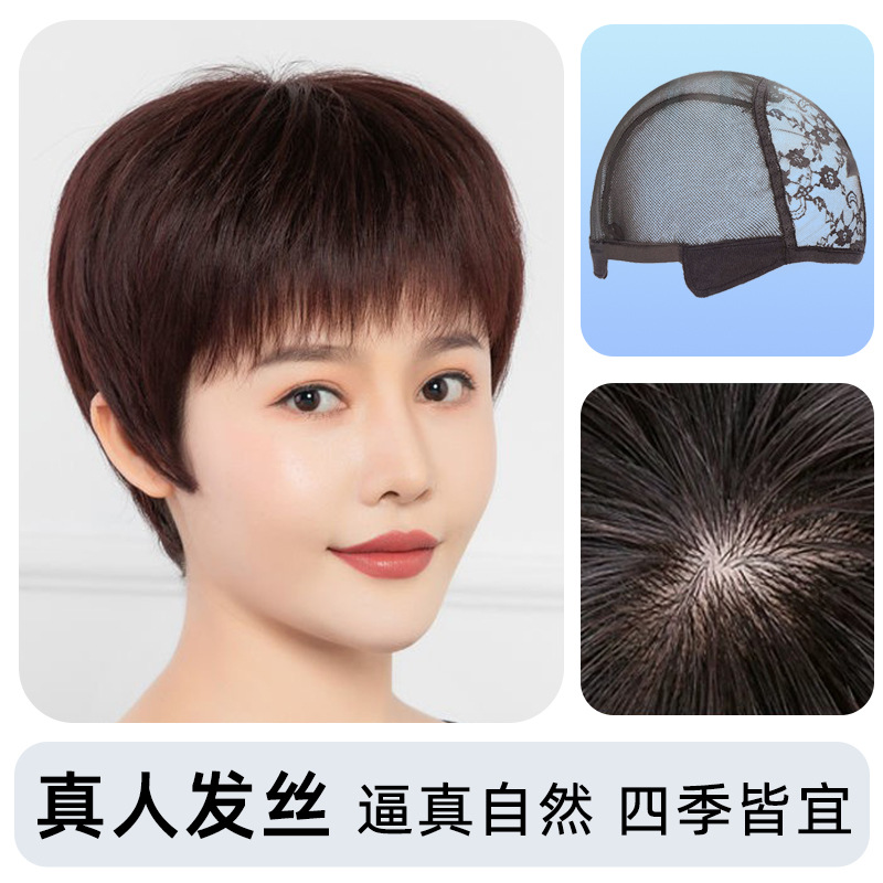 全手织全真发中老年短直发真发全头套假头发妈妈真人发丝发套透气