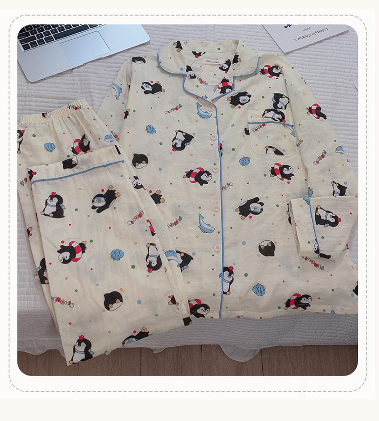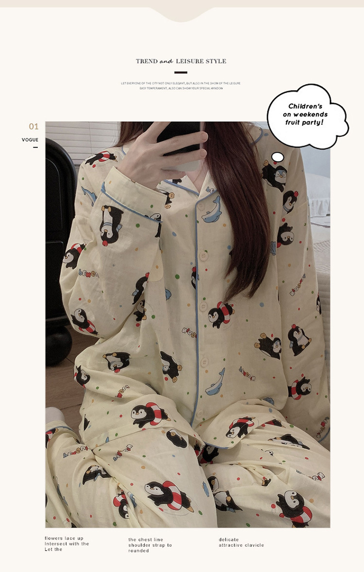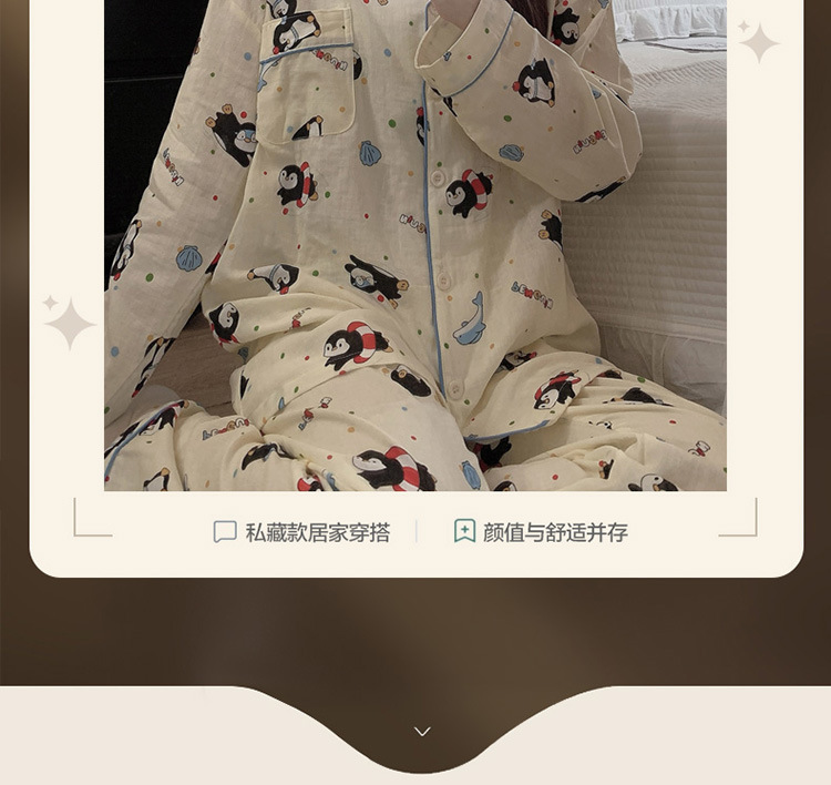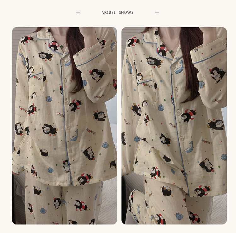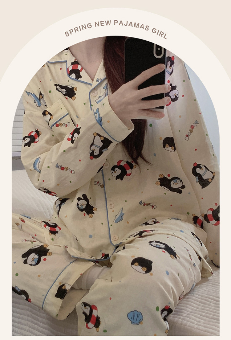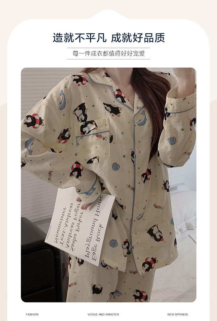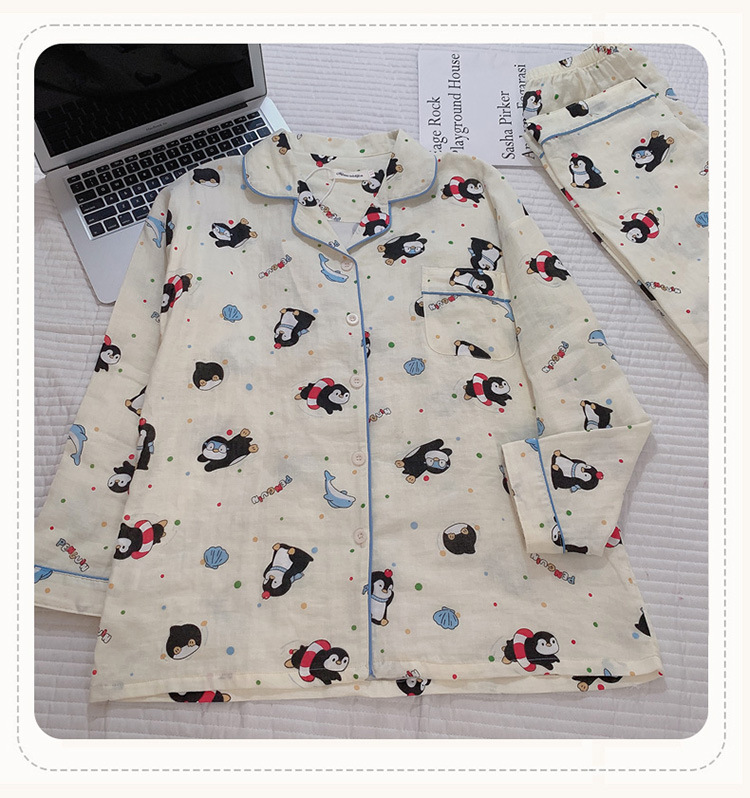 2025韓国版新型高品質アニメ純綿二重綿糸ペンギンパジャマ女性春秋長袖セットホームウェア