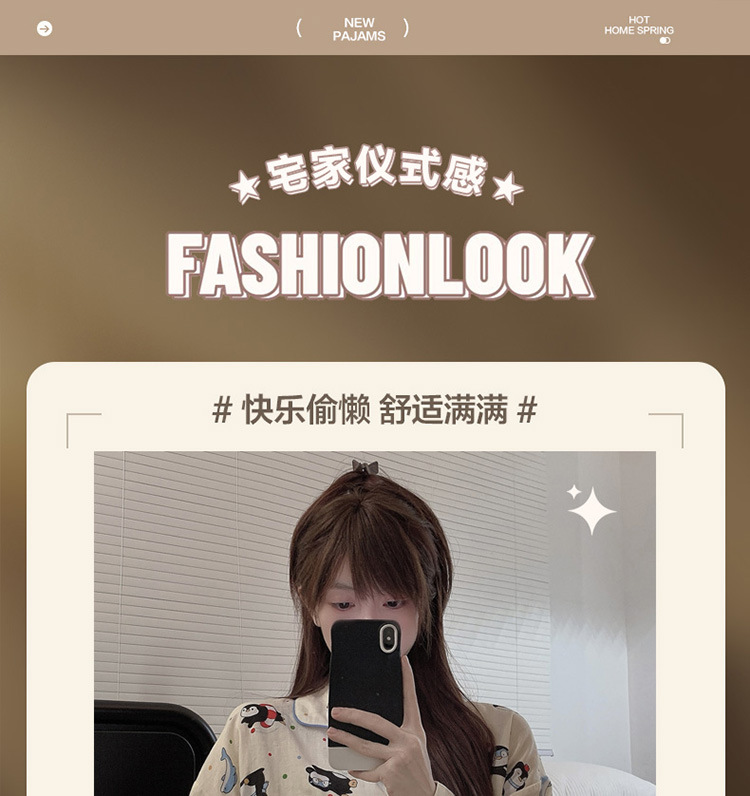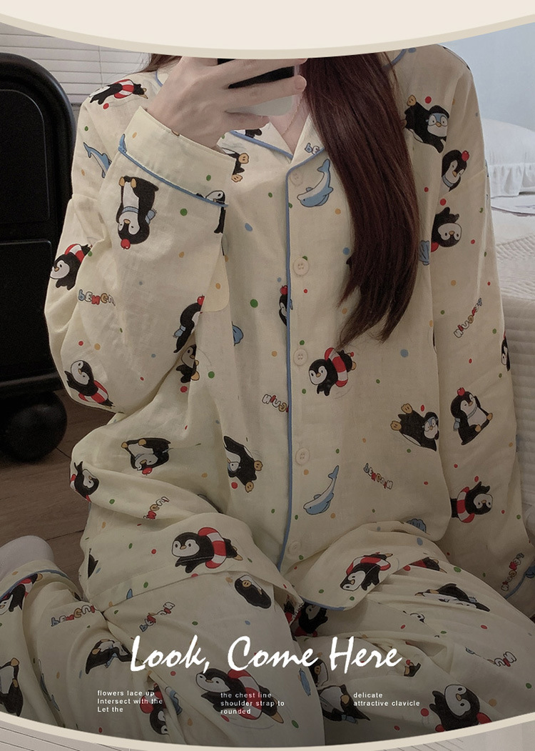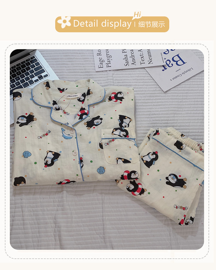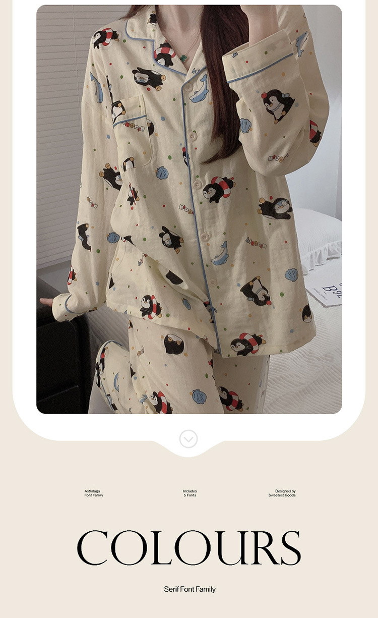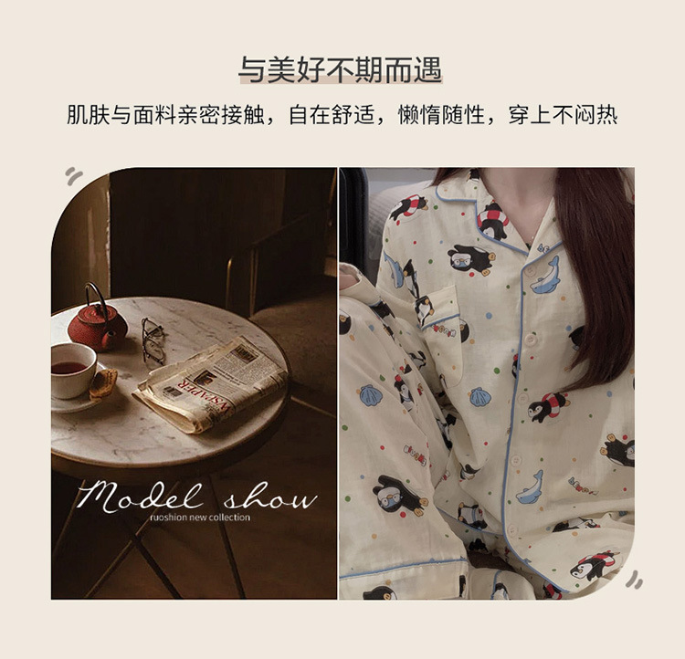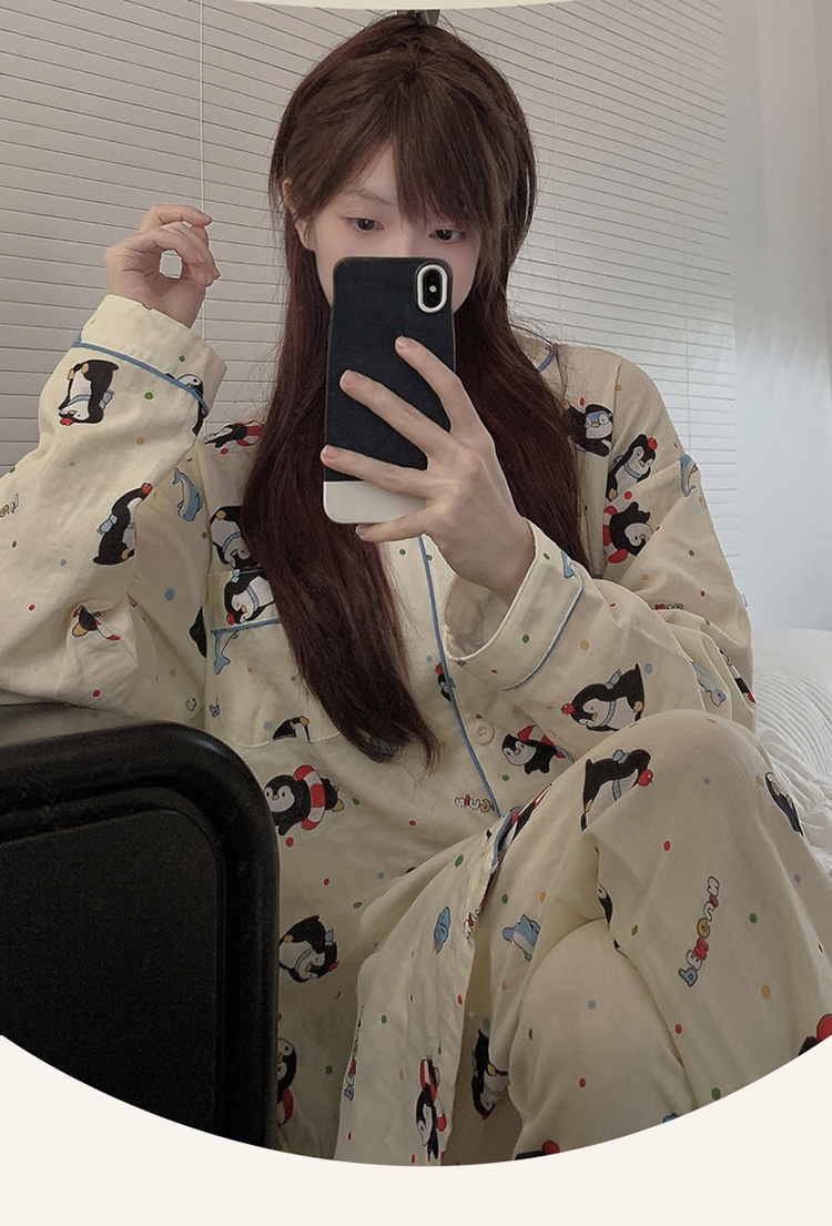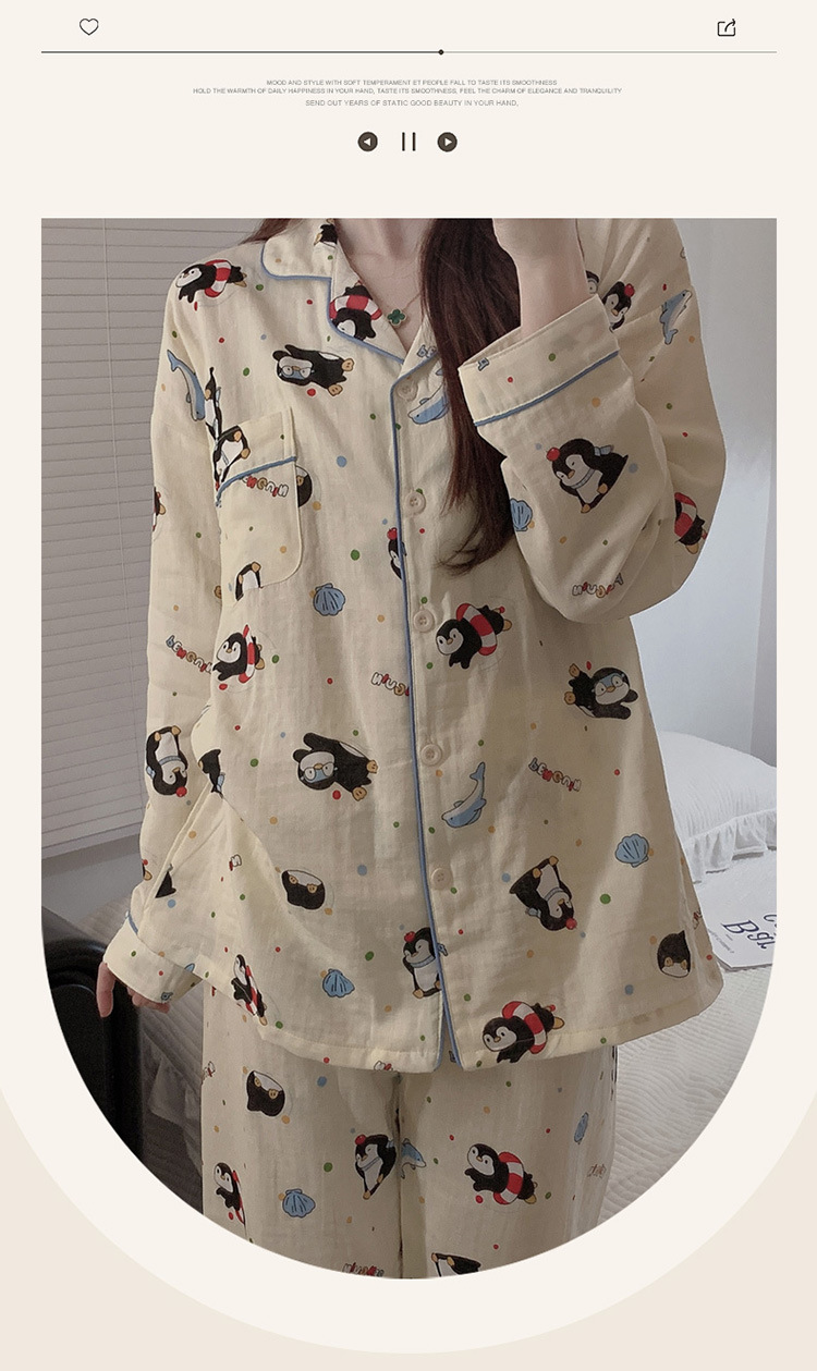 2025韓国版新型高品質アニメ純綿二重綿糸ペンギンパジャマ女性春秋長袖セットホームウェア