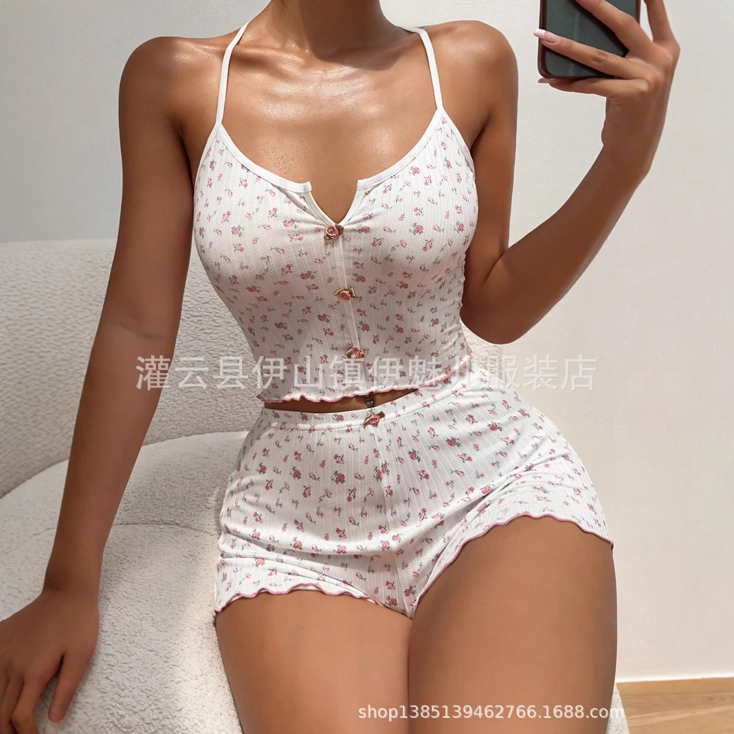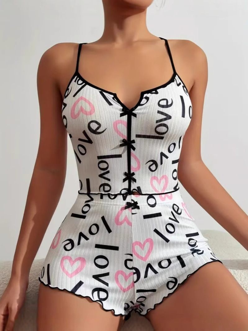 貿易ヨーロッパとアメリカのサマースーツニットピットストリップラブプリント甘いサスペンダーショーツ純粋な欲望パジャマ3点セット