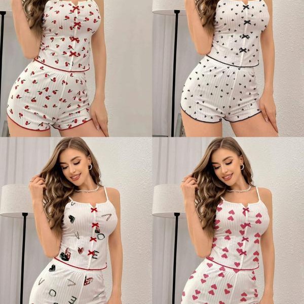 2024アマゾン速売通新商品ハート型プリント衝突色服前襟開叉ストラップパジャマセット