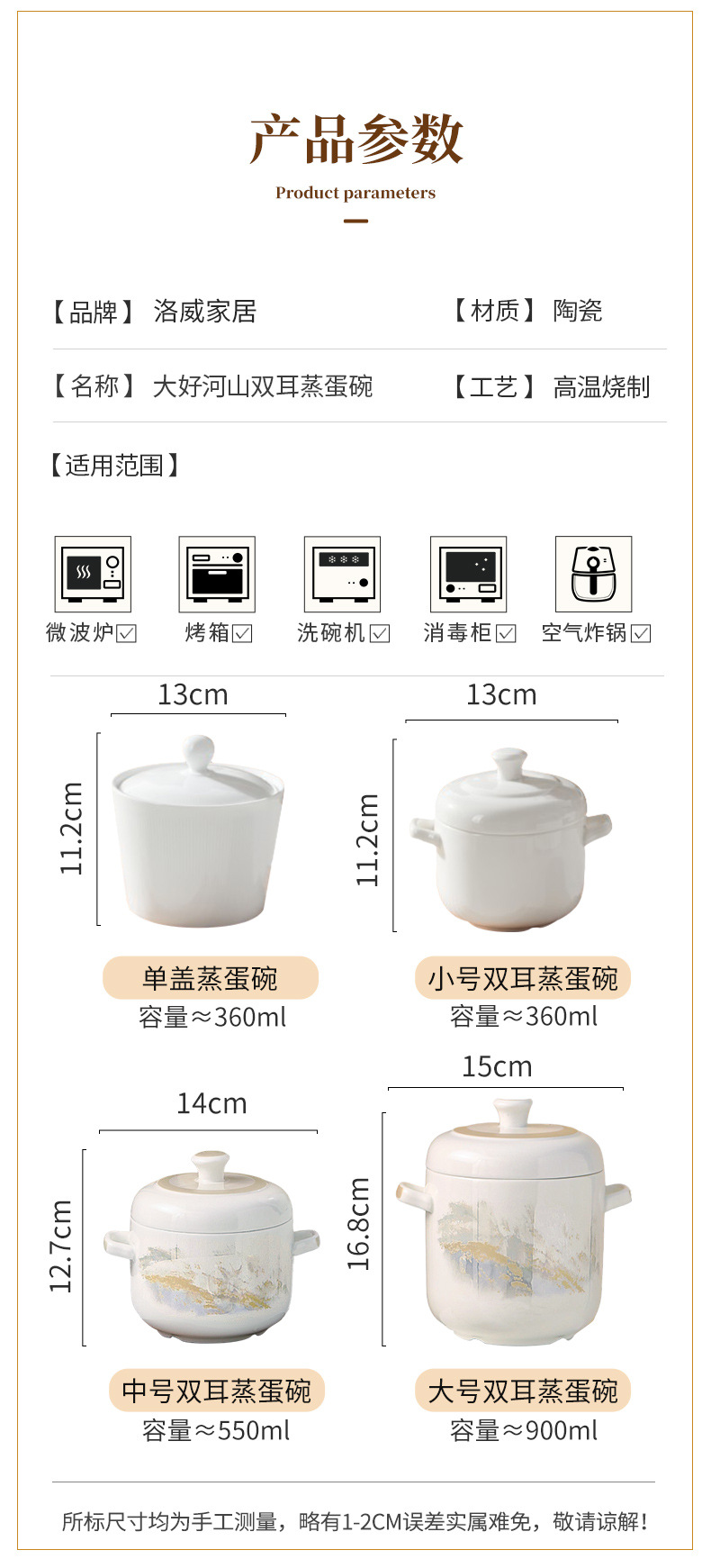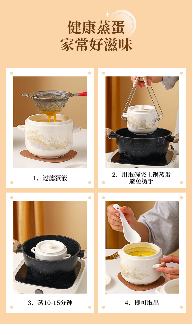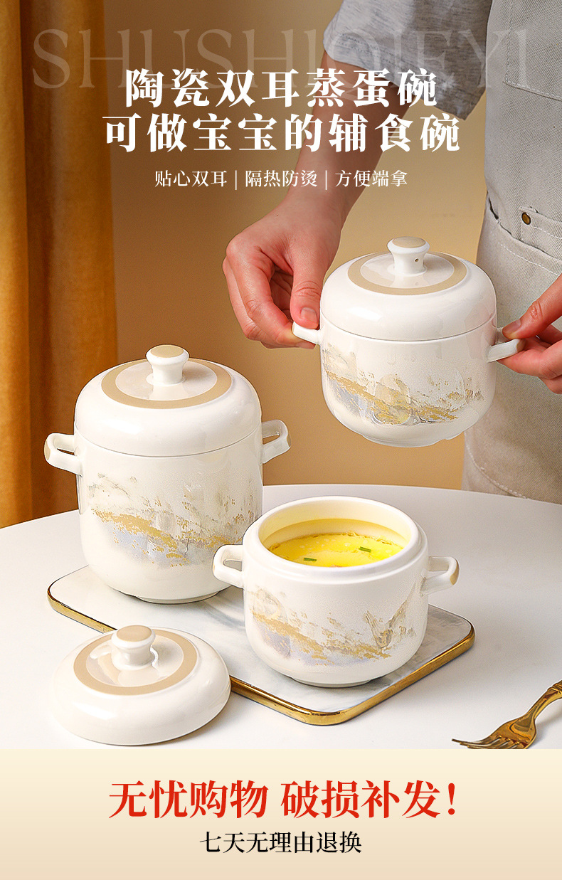 蒸し卵碗カスタマイズ家庭用蓋付き釉薬下彩陶磁器蒸し卵スープ専用碗隔水シチュー卵蒸し碗皿