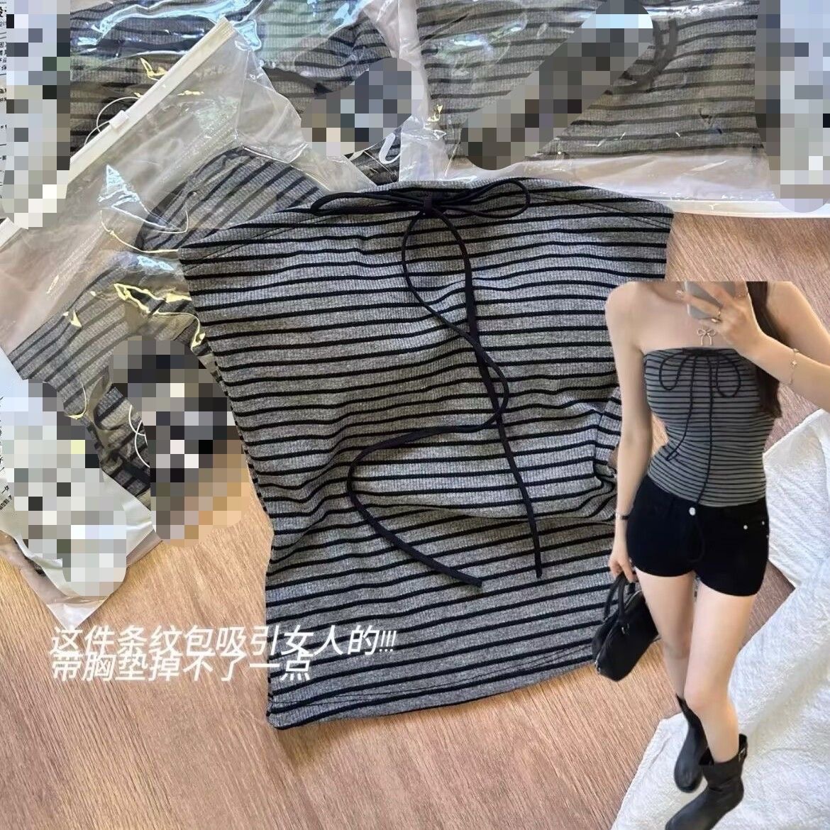 带胸垫复古条纹无袖抹胸纯欲风背心设计夏季修身蝴蝶结绑带上衣