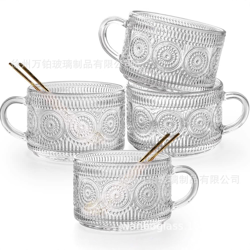 太阳花玻璃杯复古网红浮雕水杯高颜值咖啡杯牛奶燕麦杯带把手水杯