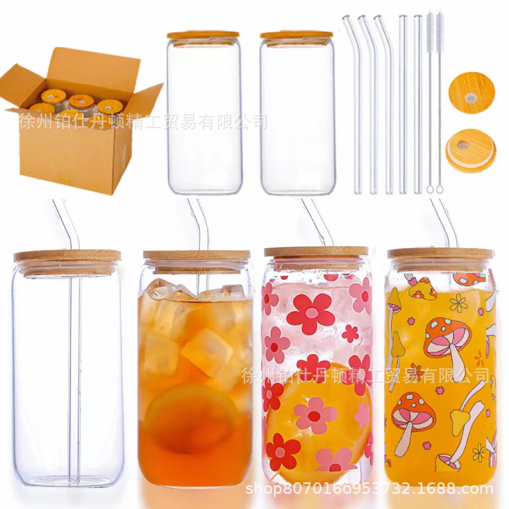 亚马逊网红可乐杯16oz梅森杯竹盖玻璃饮料啤酒杯带吸管玻璃可乐杯