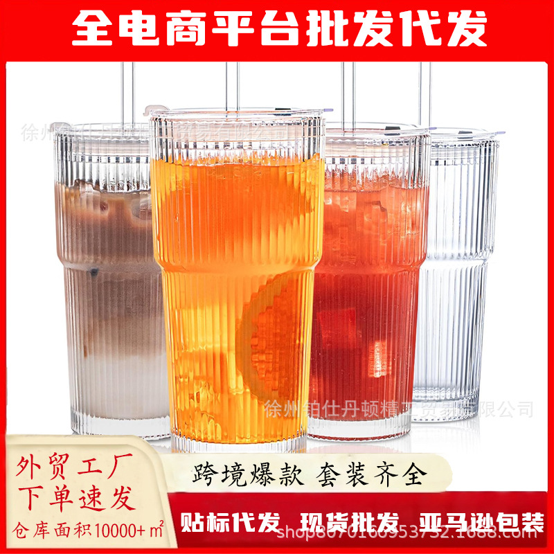アマゾン縦縞ガラスコップガラス蓋付きストローカップミルクティーコーヒージュースカップウイスキーグラス