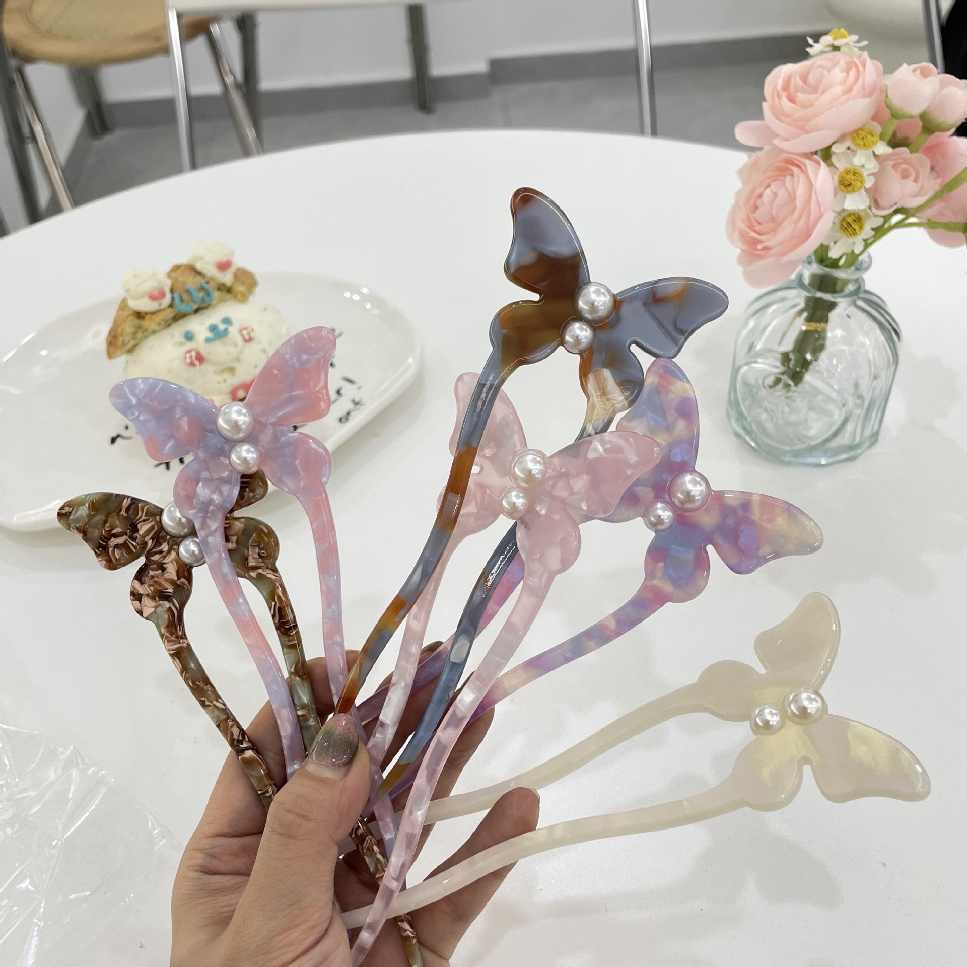 新しい真珠の蝶の酢酸のかんざしの簡単な翼の髪飾りの甘い少女の古風の実用的なかんざしの器