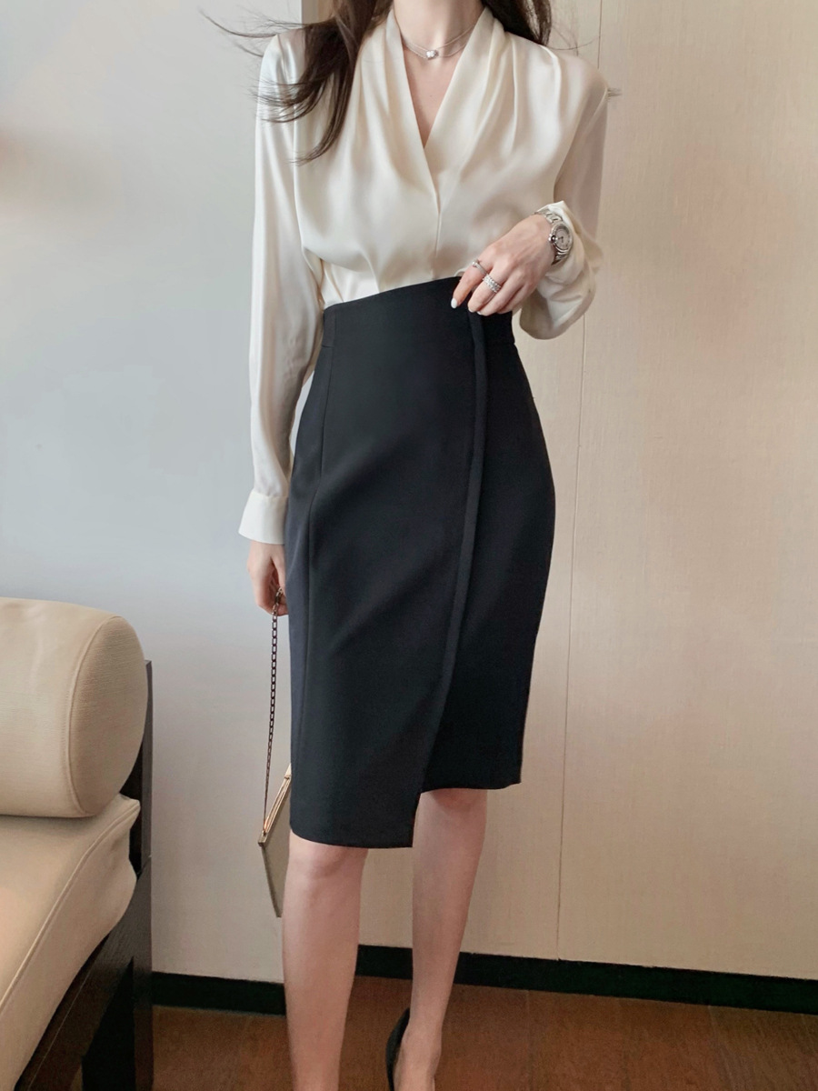 2024春と秋の襟の白いシャツの女性の長袖のフランスのデザイン感の小さい大衆は上着の職業のサテンの上着を覆います。