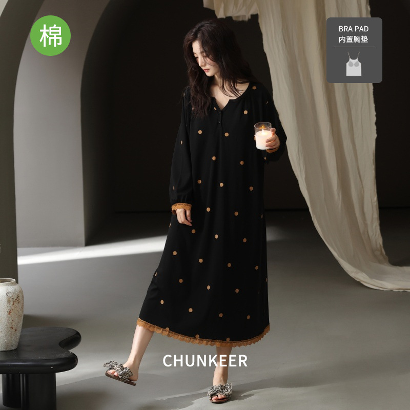 拉架棉带胸垫长袖睡裙女款秋冬季中长款可外穿休闲宽松纯棉家居服