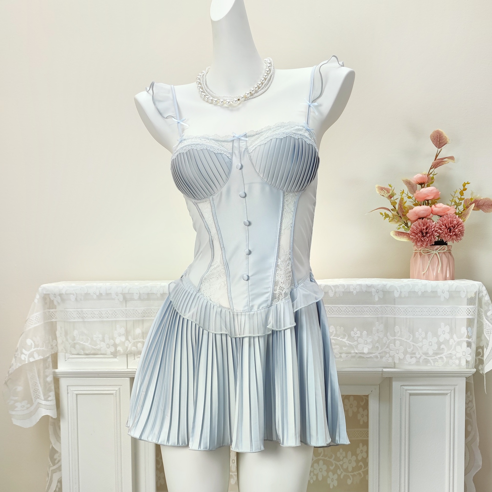 原版跨境高级感冰丝带胸垫约会吊带睡裙褶皱法式纯欲睡衣家居服女