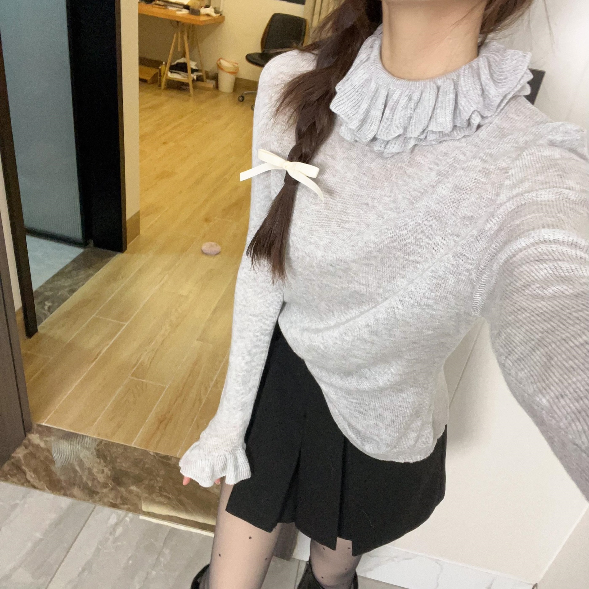 甜美减龄荷叶领双层花边翻领修身针织衫气质显瘦轻薄打底衫女上衣
