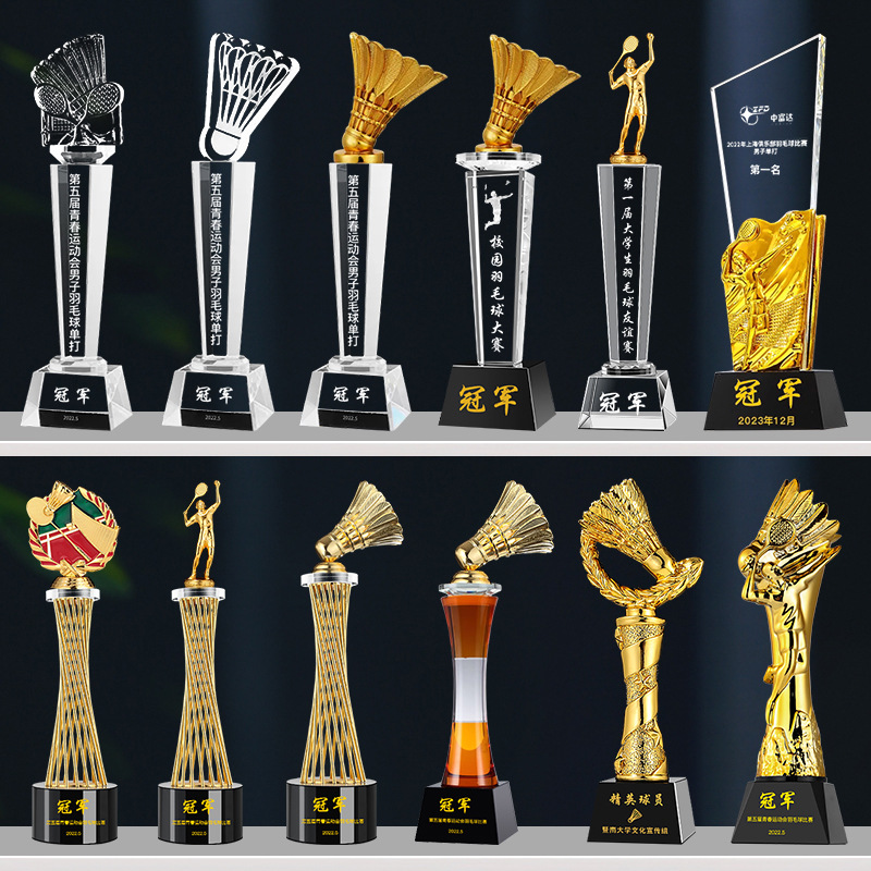 バドミントンクリスタルトロフィー、カスタムスポーツ大会、優秀社員、樹脂製金属メダル、ギフト、金メッキ