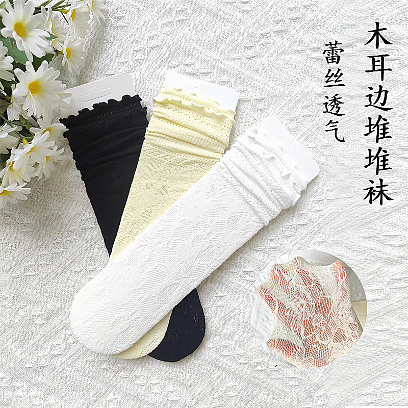 女性用夏用薄い中空通気性レースパイルソックス、木耳レースメッシュソックス、女性用白ミッドチューブソックス