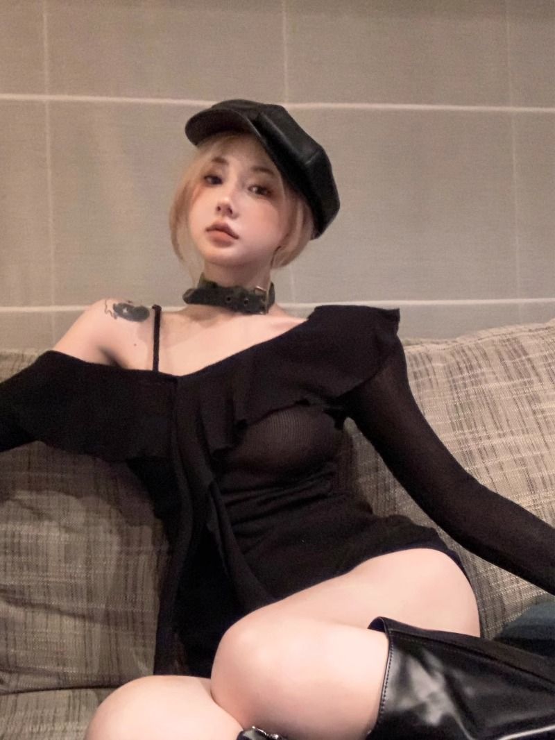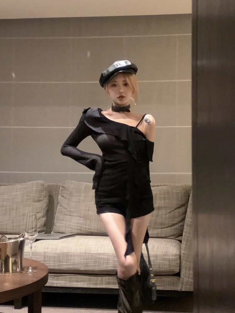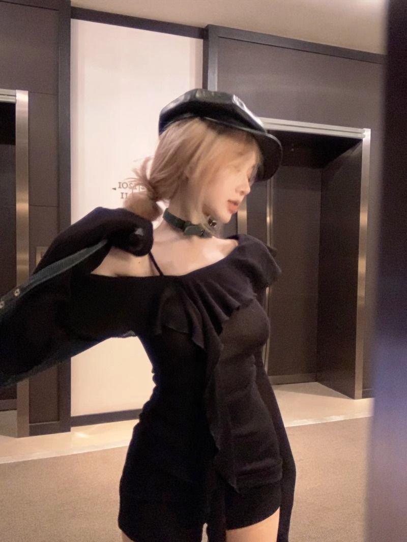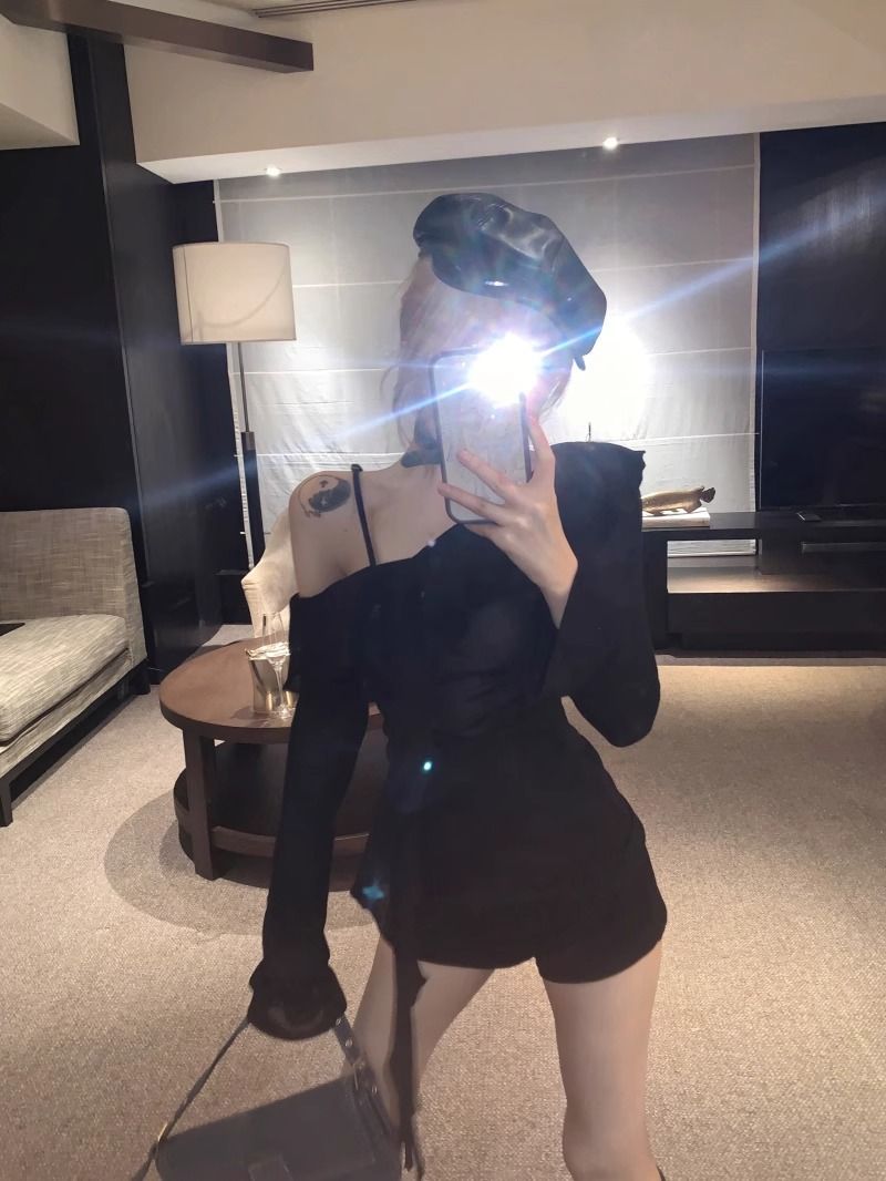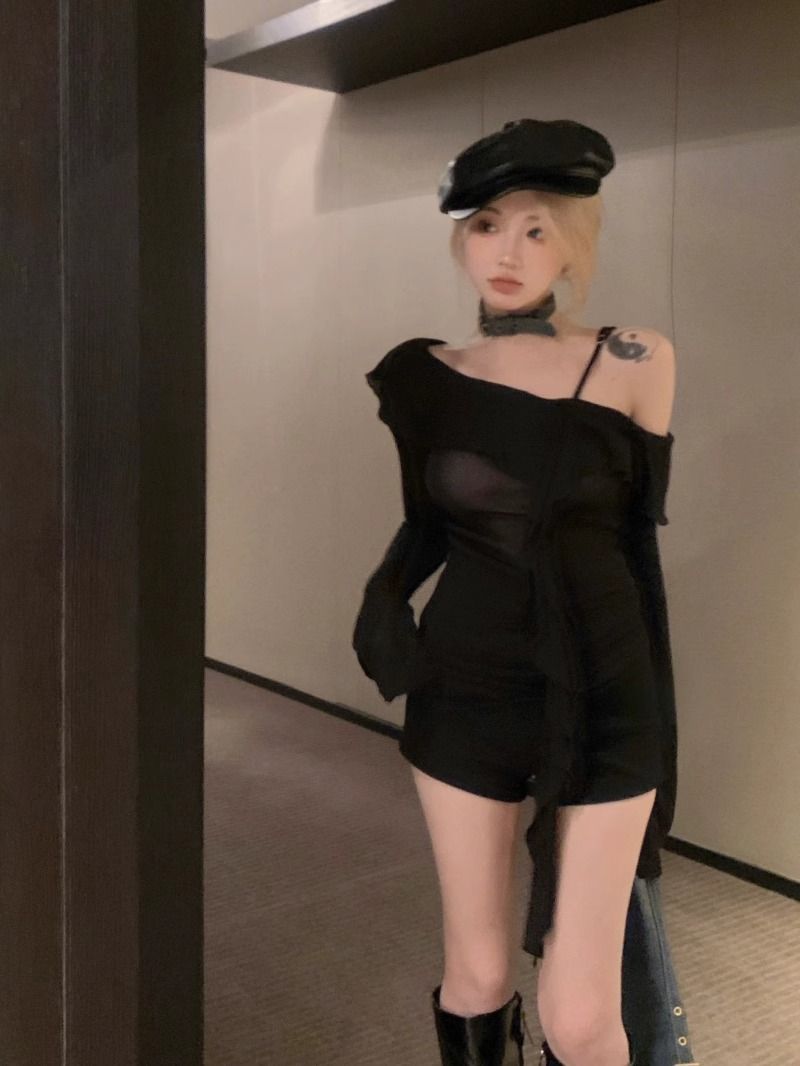 黒い一字肩長袖日焼け止めニットtシャツのデザイン感が肩を露出してスリムに見えます。