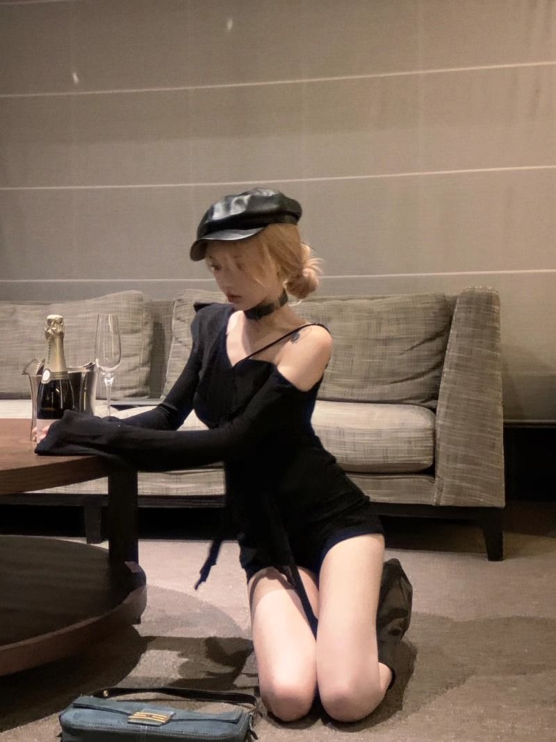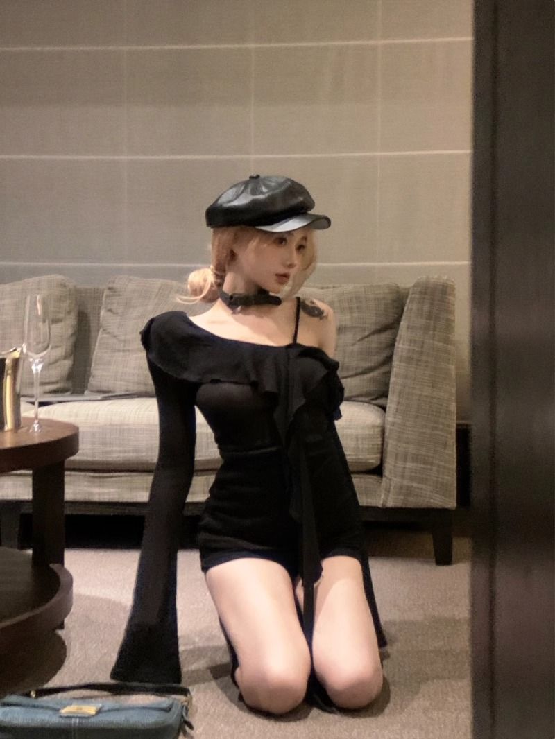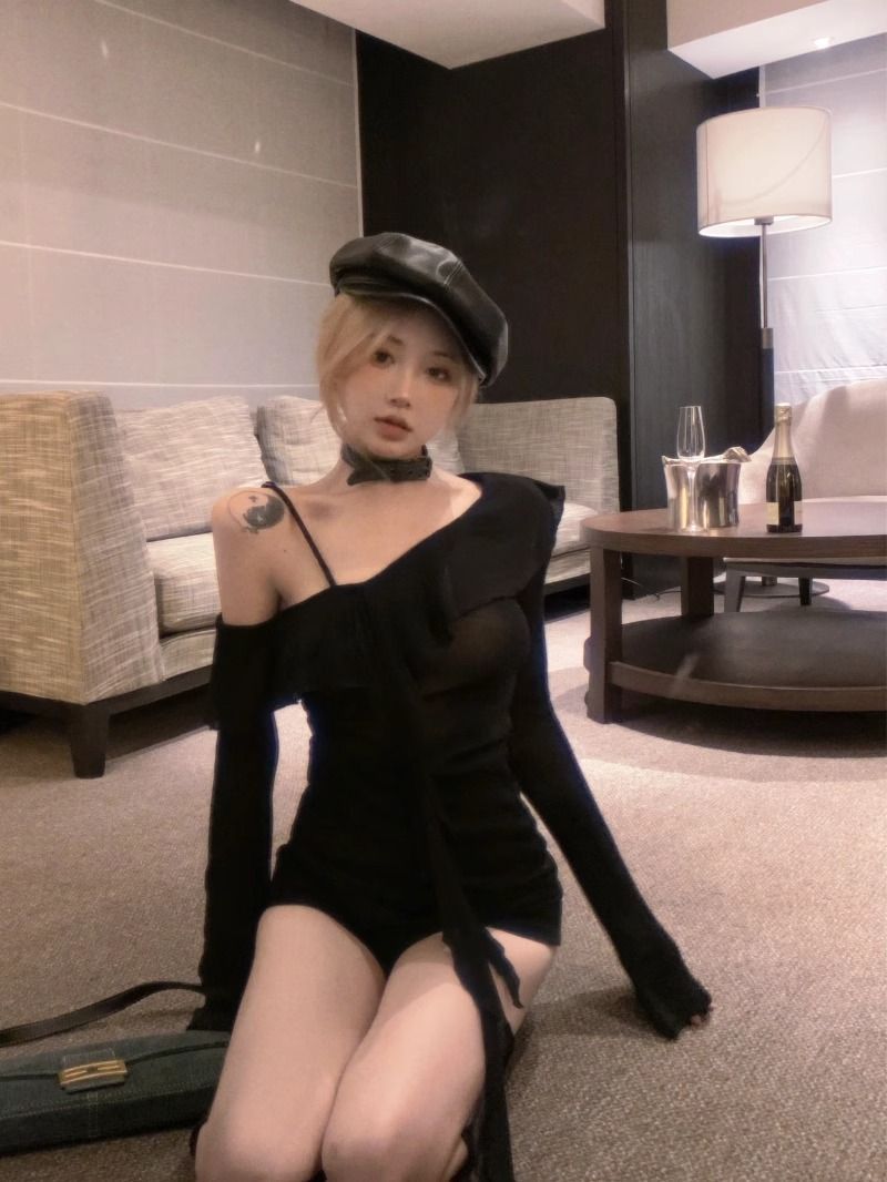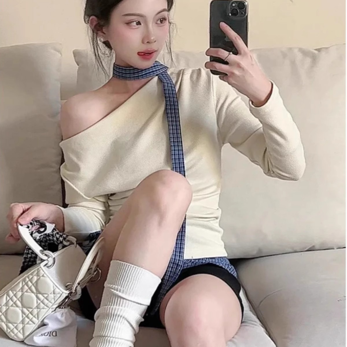 2024新型露肩一字襟偽長袖tシャツ早秋金修身痩せギャル小衆上着ins
