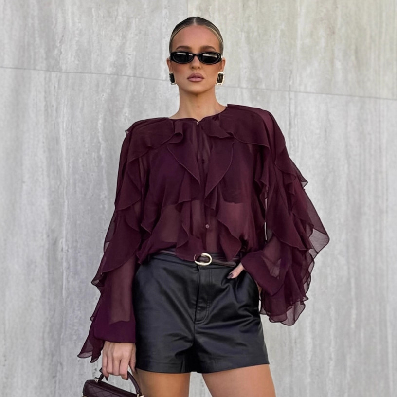 法式复古圆领荷叶边上衣女2026春季设计感优雅酒红色雪纺罩衫女装