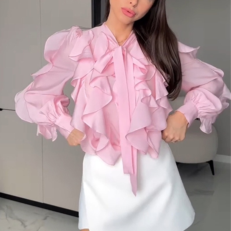 2025欧米風春婦人服長袖積層装飾ハスの葉の縁のシャツ6112