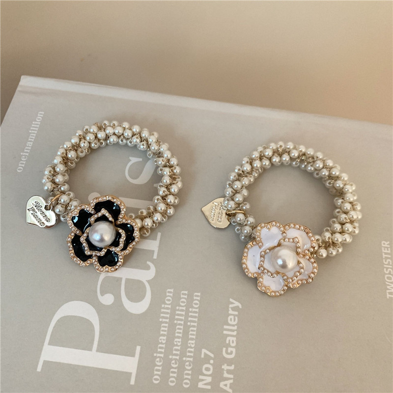 韓国の高級感の小さい香風の金属のツバキの花の真珠のシュシュのフランスの復古の頭縄のシンプルな気質の皮筋
