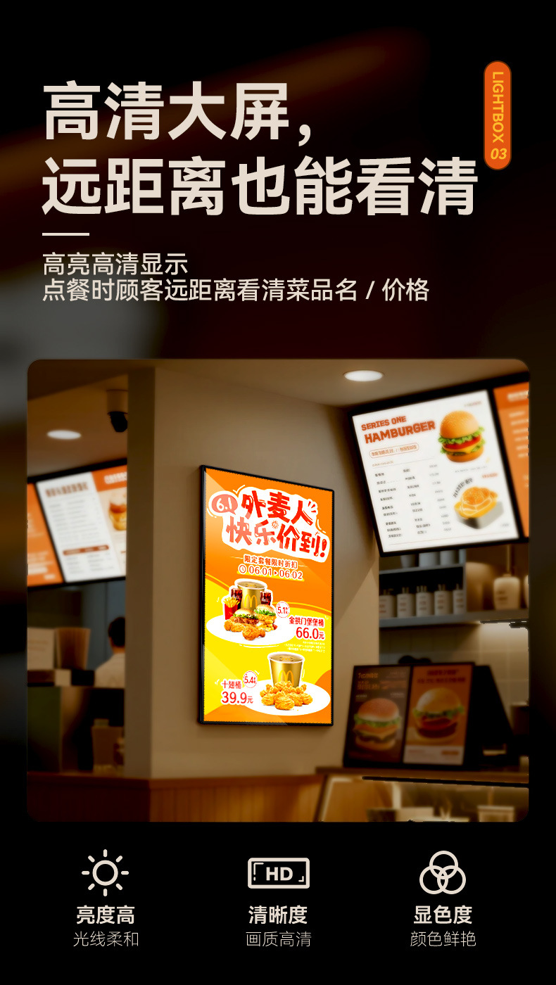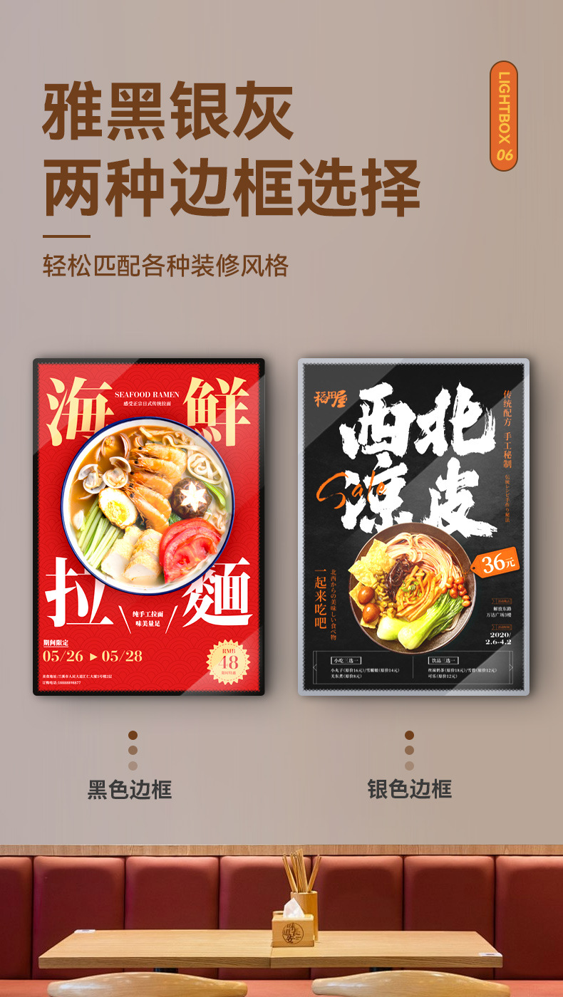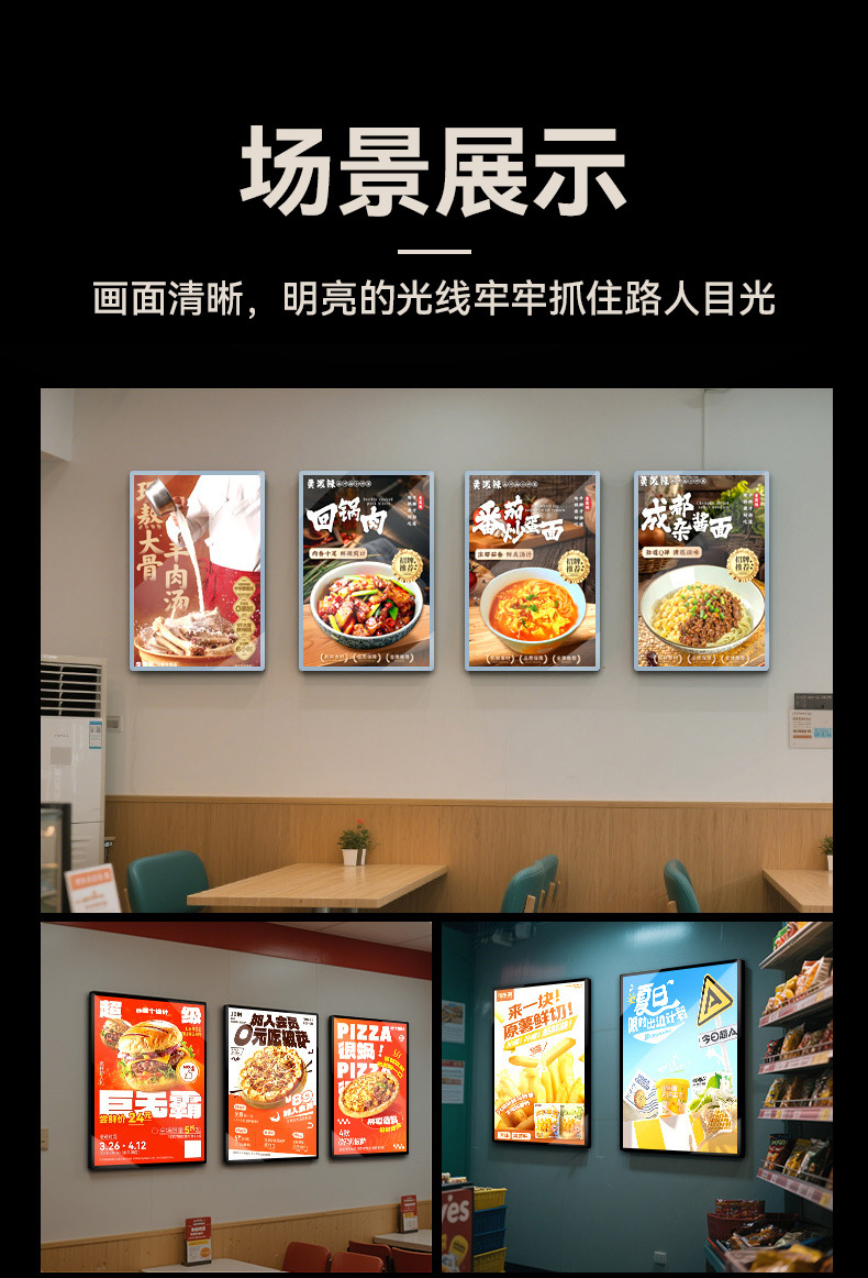 超薄型絵柄広告ライトボックス、飲食店看板、壁掛け発光メニュー表示板、LED注文価格表