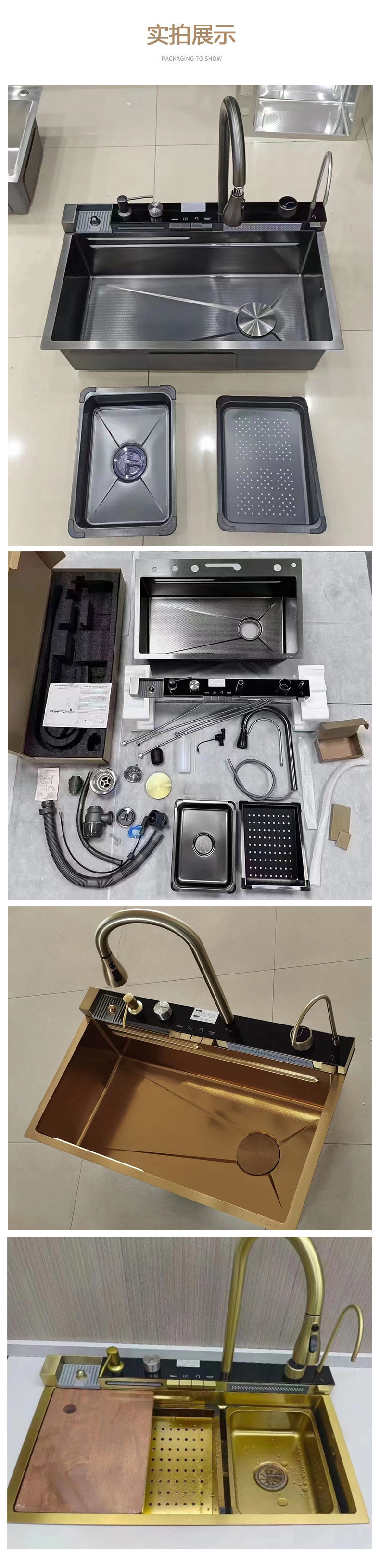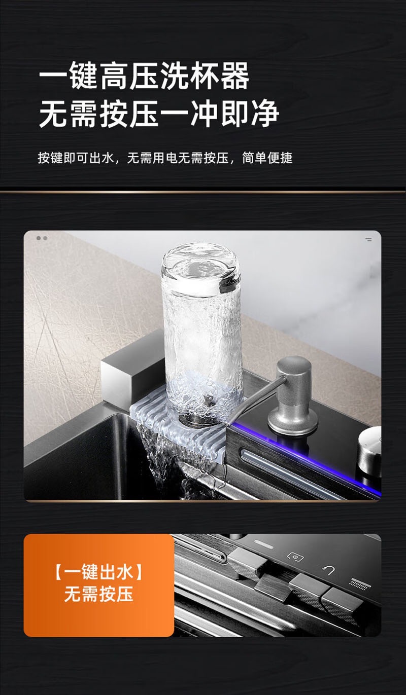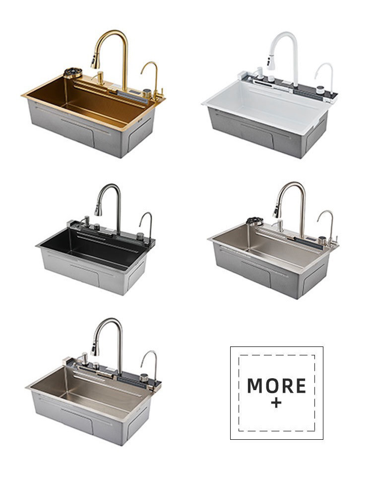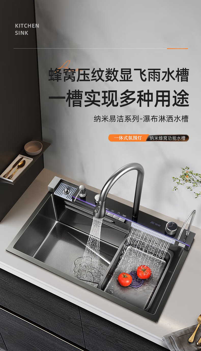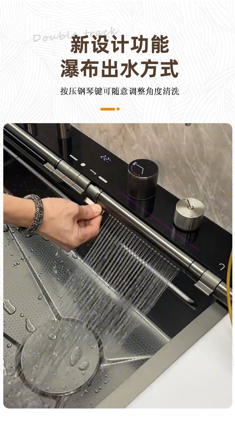 此款为一体式多功能飞雨手工水槽,有201/304不锈钢两种材质可选。配件包含:裸槽+一体式龙头+盆中盆+沥水篮+菜板+台控下水。