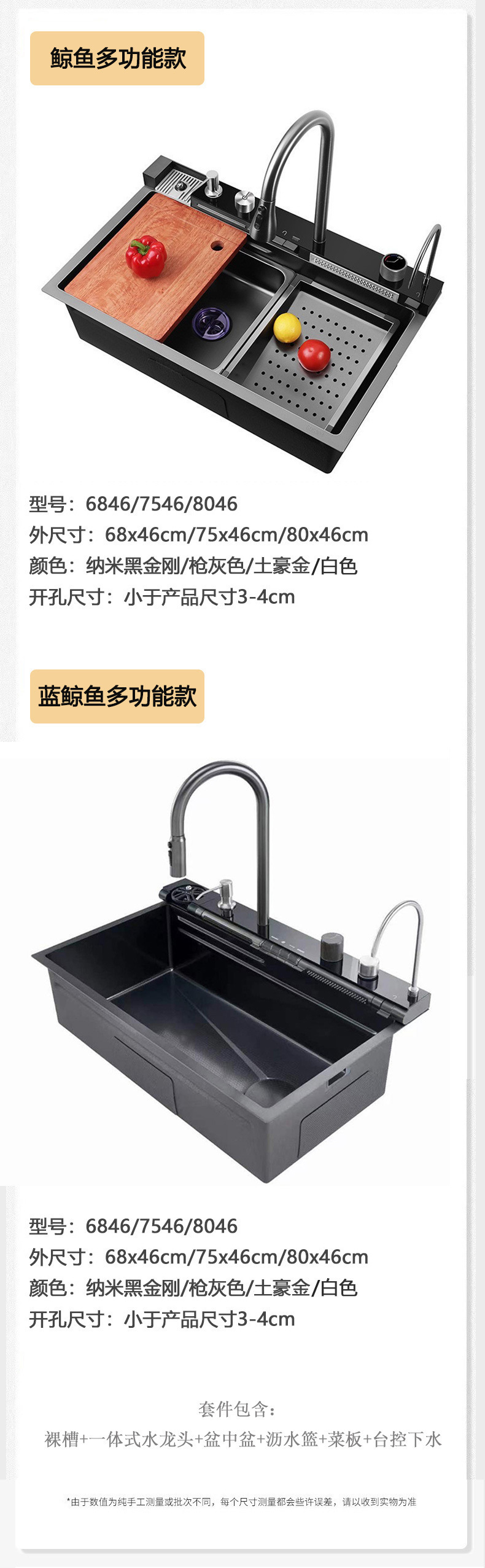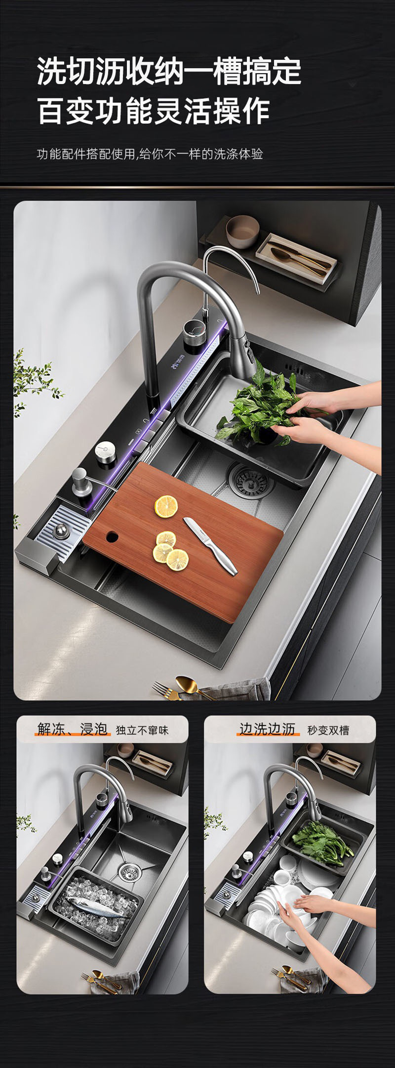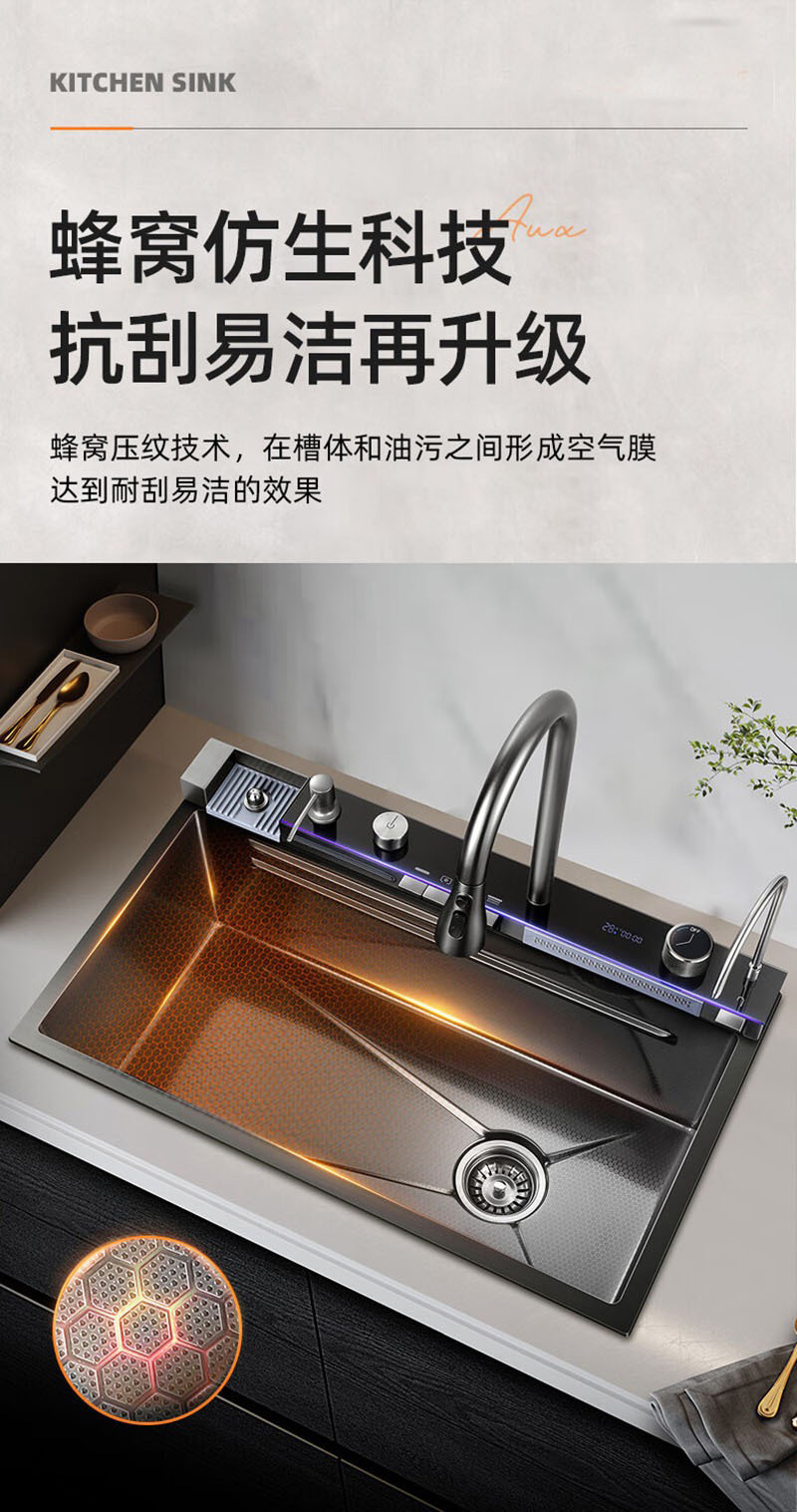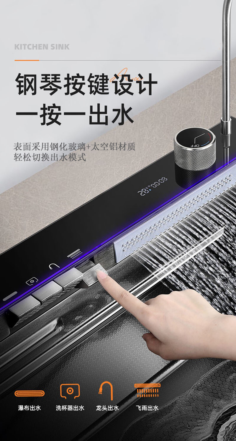此款为一体式多功能飞雨手工水槽,有201/304不锈钢两种材质可选。配件包含:裸槽+一体式龙头+盆中盆+沥水篮+菜板+台控下水。
