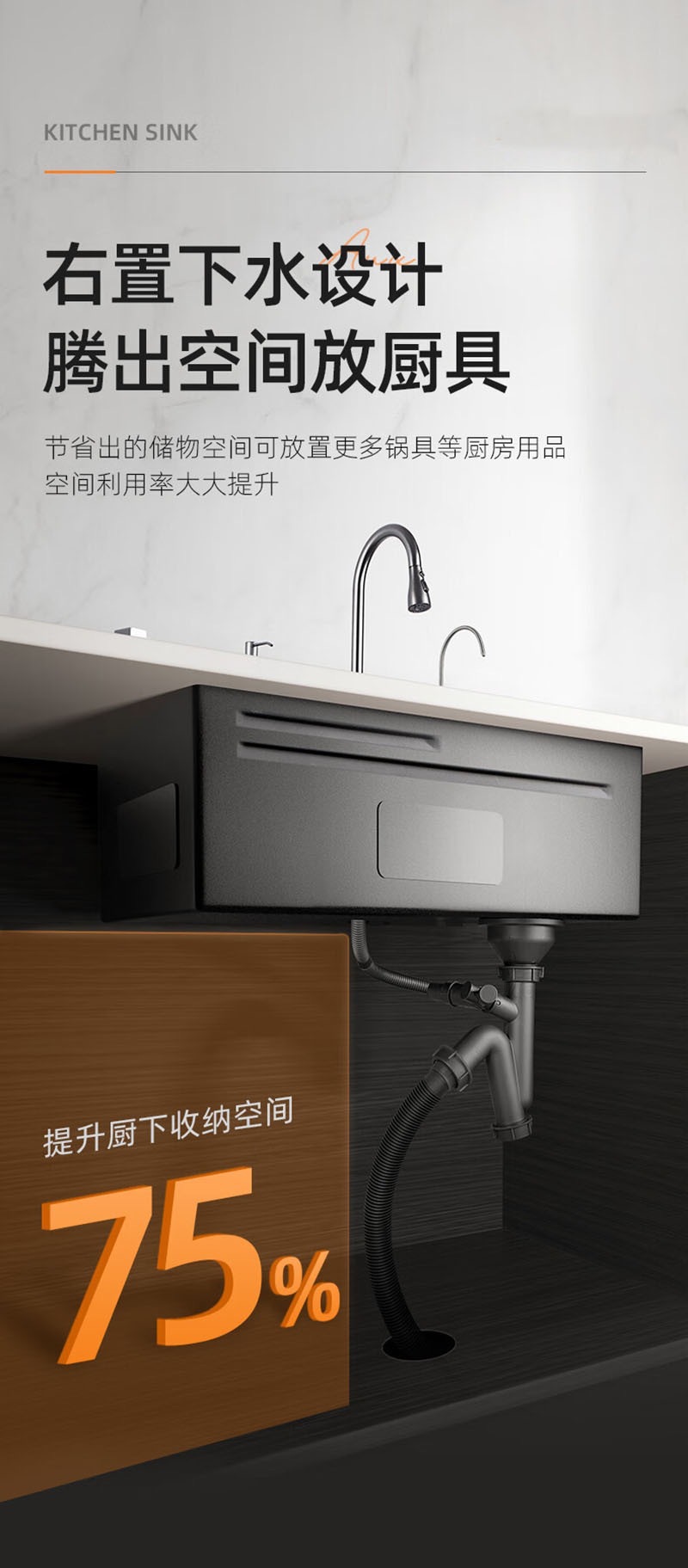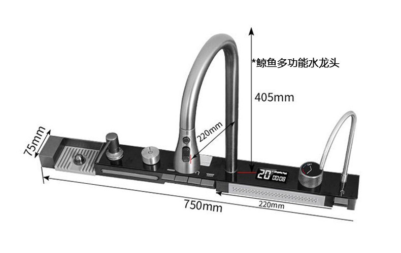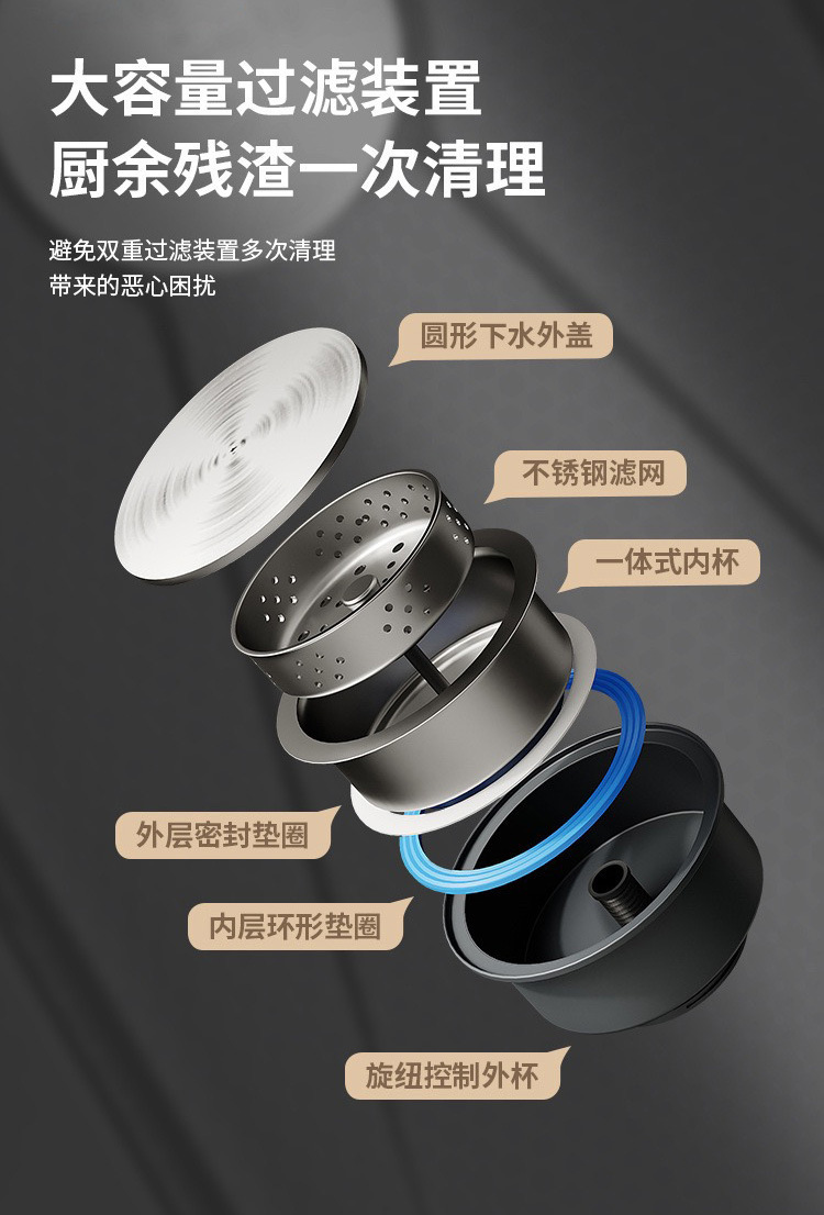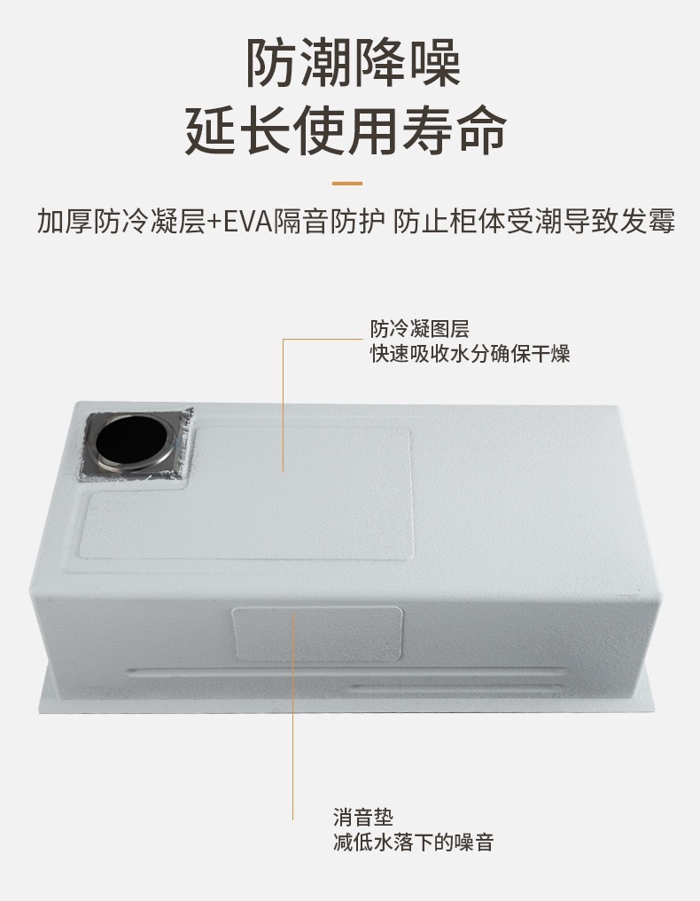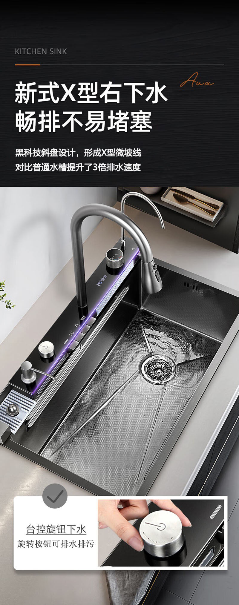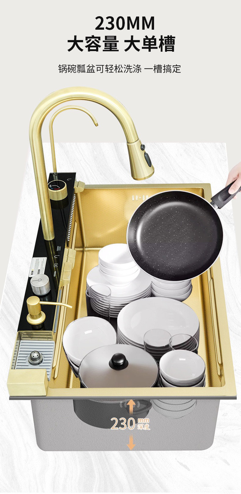此款为一体式多功能飞雨手工水槽,有201/304不锈钢两种材质可选。配件包含:裸槽+一体式龙头+盆中盆+沥水篮+菜板+台控下水。