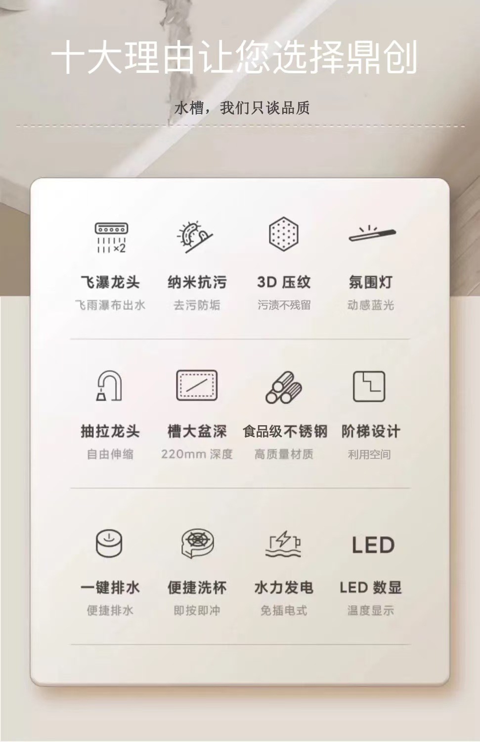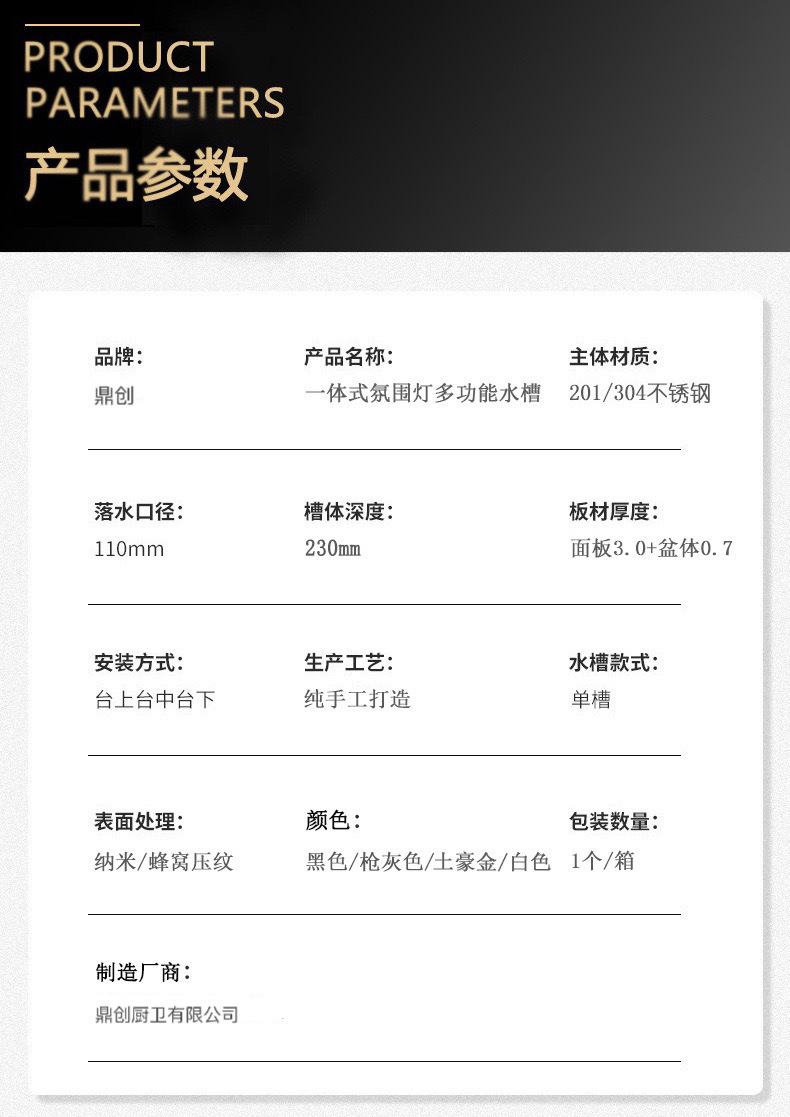 鼎创厨卫厂拥有强大的供货能力,专业生产水槽20余年,主要出口北美/欧洲/东北亚/亚洲/南美等全国世界各地,本店所有产品均为本厂自产自销,可定做任意尺寸形状,您需要的水槽款式尺寸我厂都可以加工定制,价格可根据数量商量,量大价优,质量绝对保证,不偷工减料,只为长期合作。