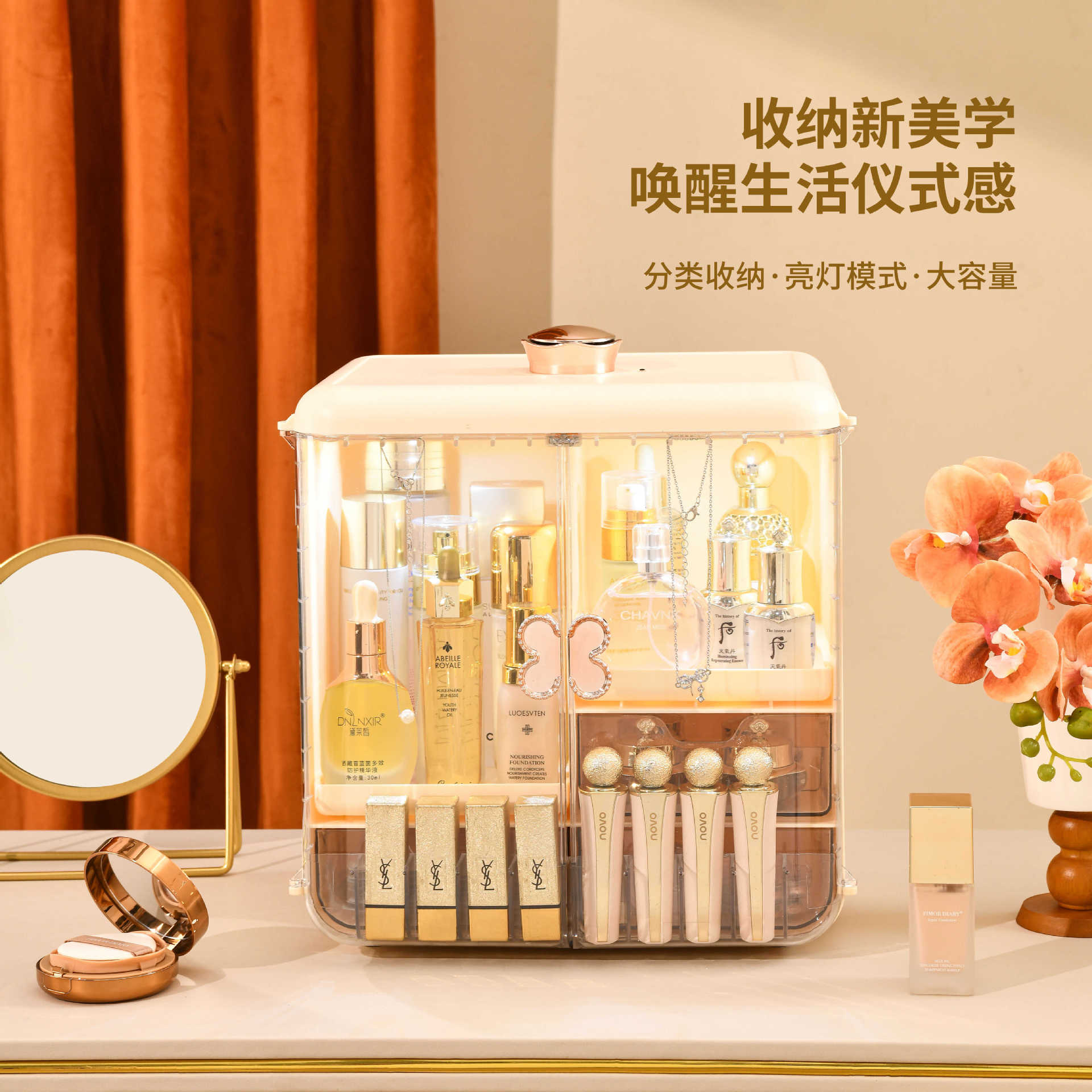 轻奢化妆品收纳盒桌面口红盒收纳架梳妆台防尘大容量护肤品收纳柜