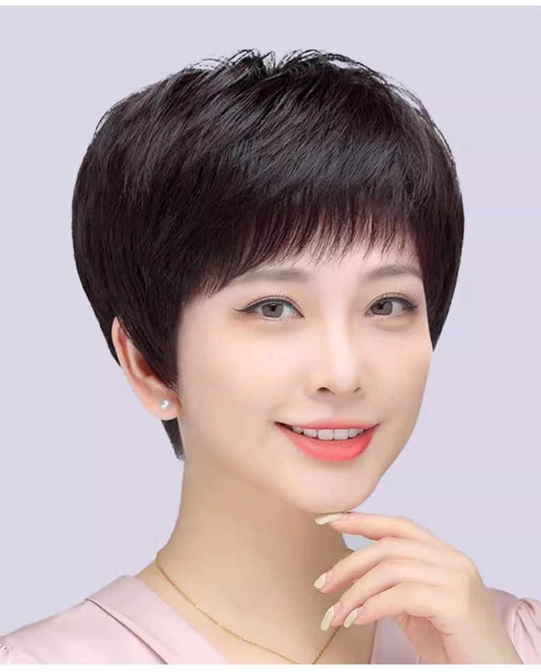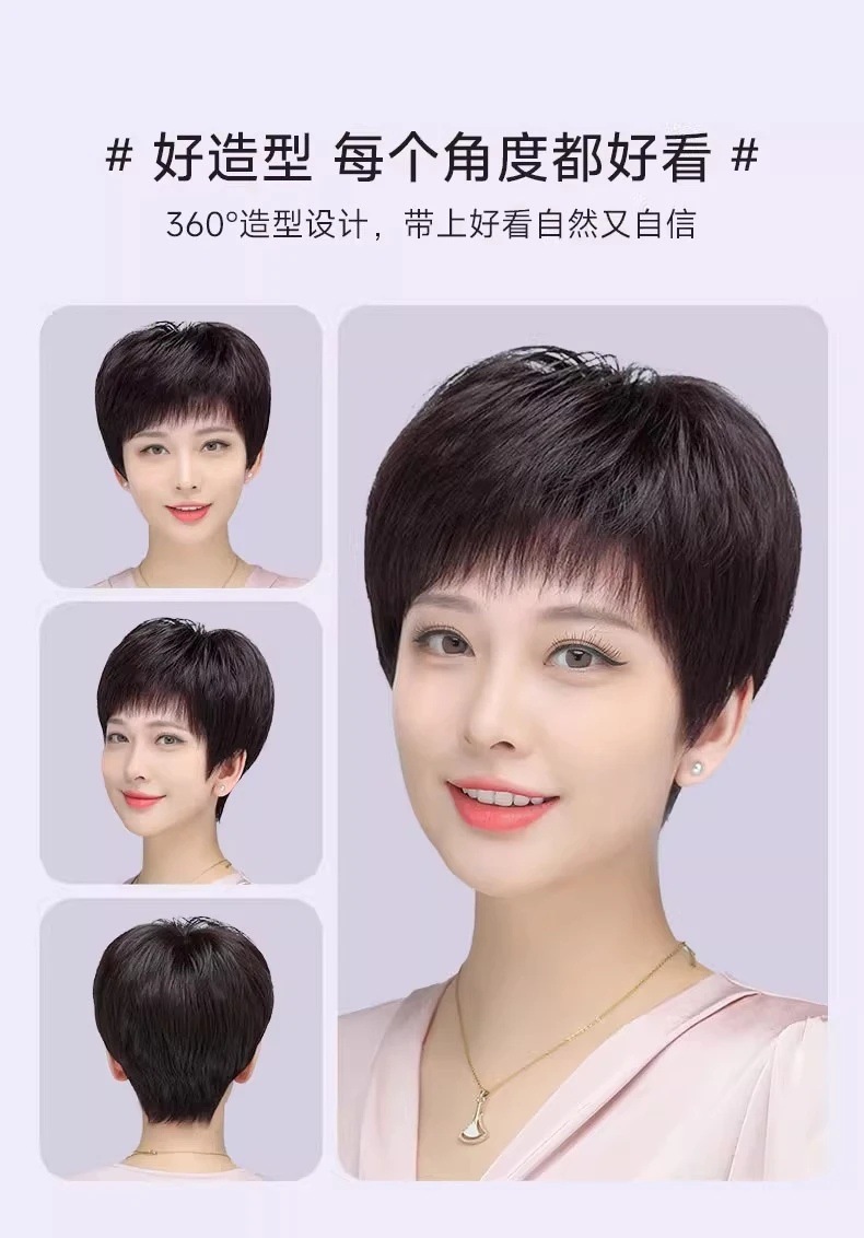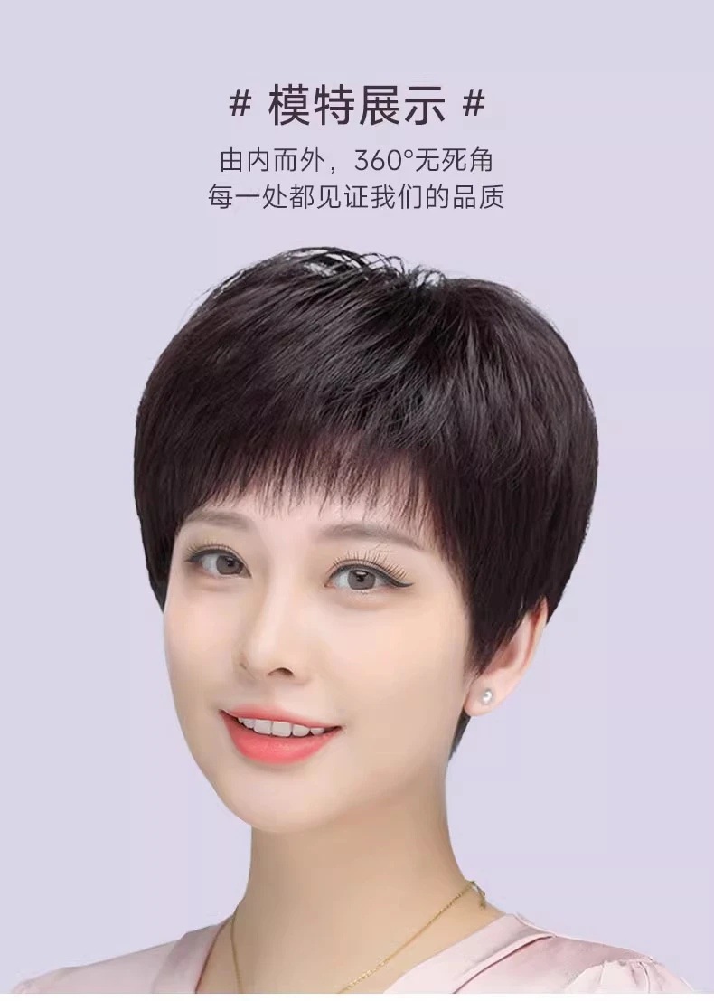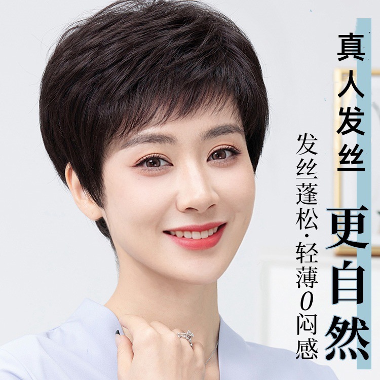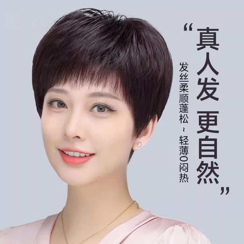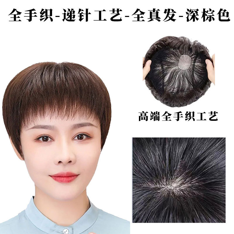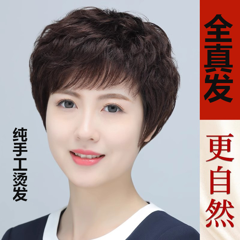 全手织全真发中老年短直发真发全头套假头发妈妈真人发丝发套透气