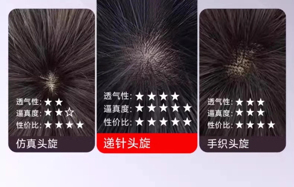 男性の全針かつらの本物の髪の額に傷のないかつらの頭の上に傷のない額の見えない髪の線があります。