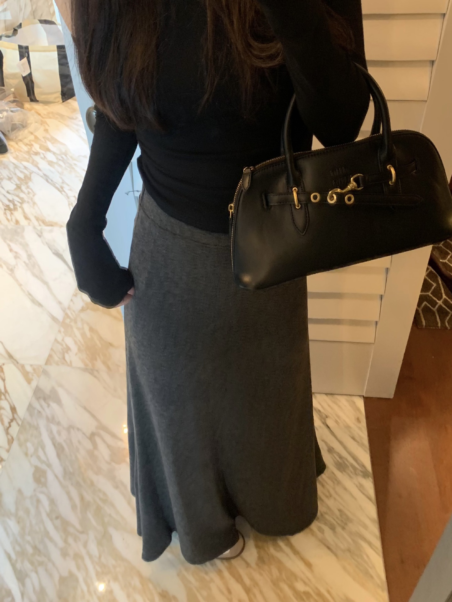 黒いハイウエストの優しい風の気質の魚の尾のスカートの女性の春秋のデザイン感の独特なゆったりしているハスの葉の辺のロングスカート