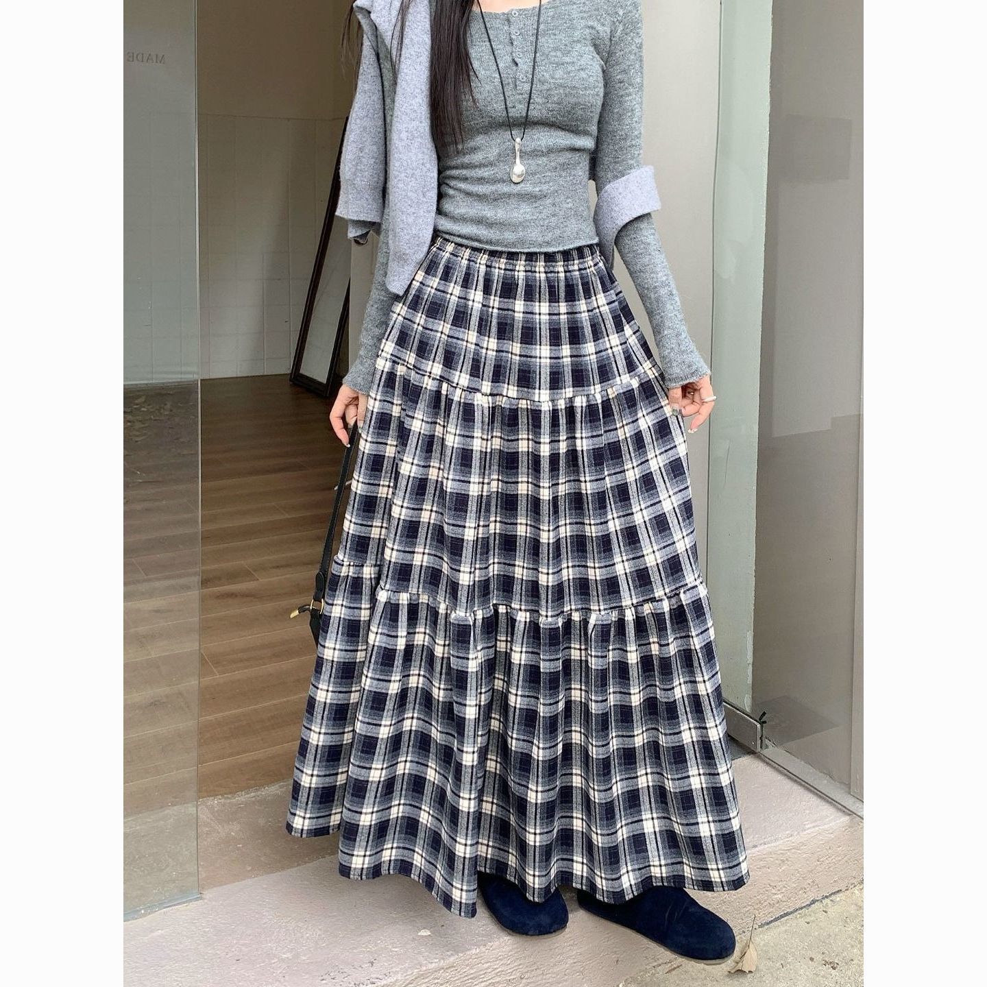 2026格子半身裙女新款韩版高腰a字裙拼接中长款显瘦蛋糕长裙