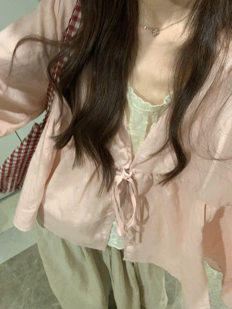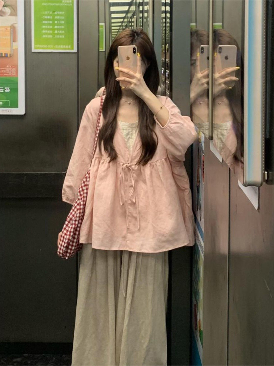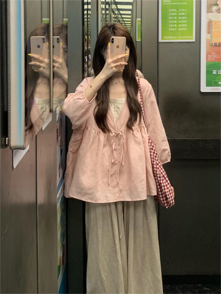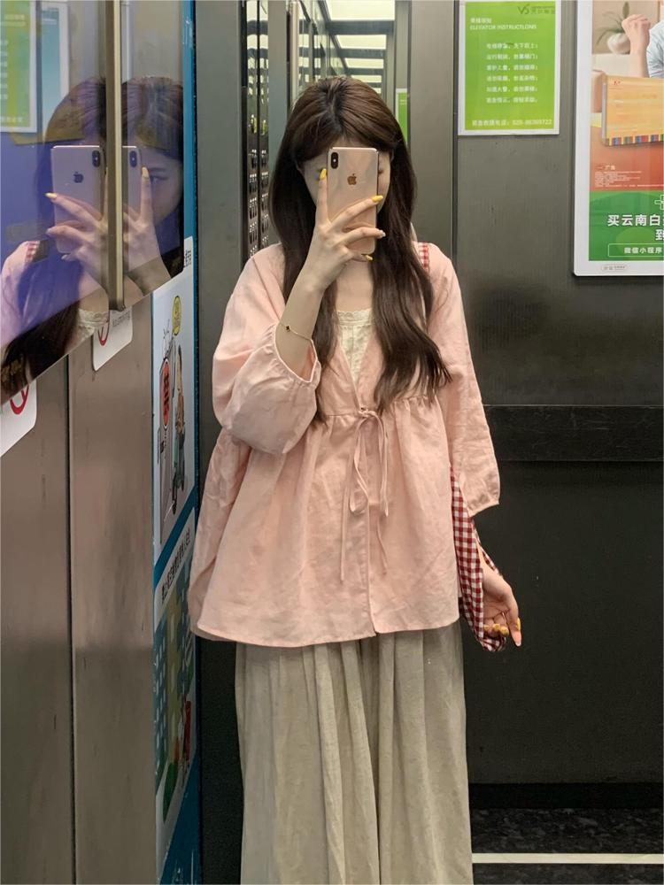 ピンクの純ラミー麻oversize日焼け止め長袖シャツ女装2025春のゆるいデザイン感ファッション上着
