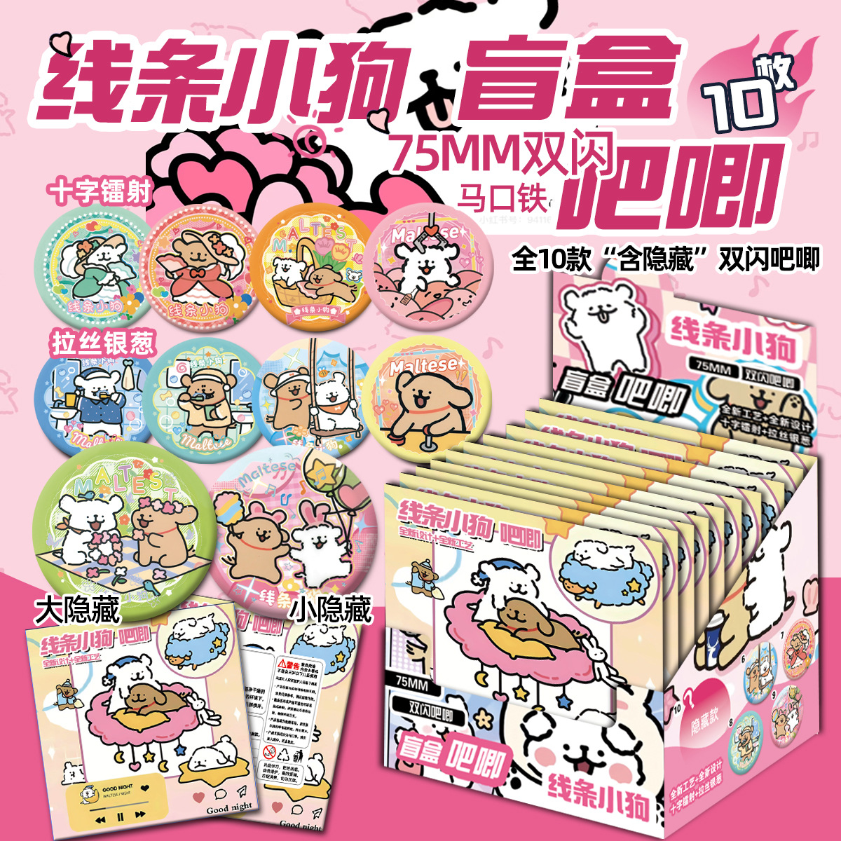 ラインの子犬のブラインドの箱の漫画の周辺の双閃のレーザーのバッジの谷子の馬の口の鉄の75mmは痛みを刺して盲袋を包みます。