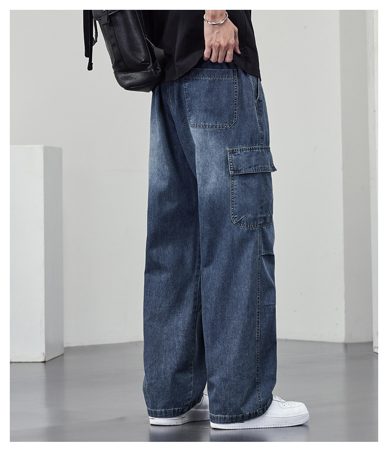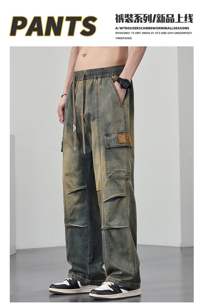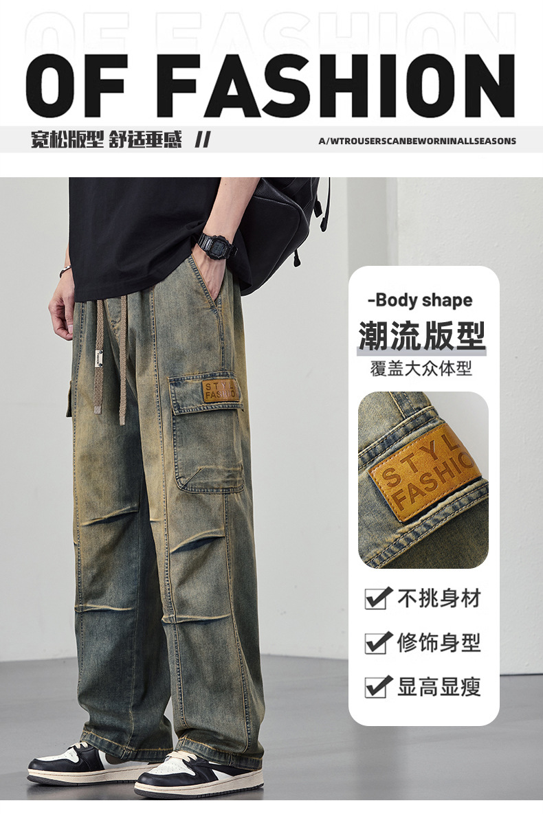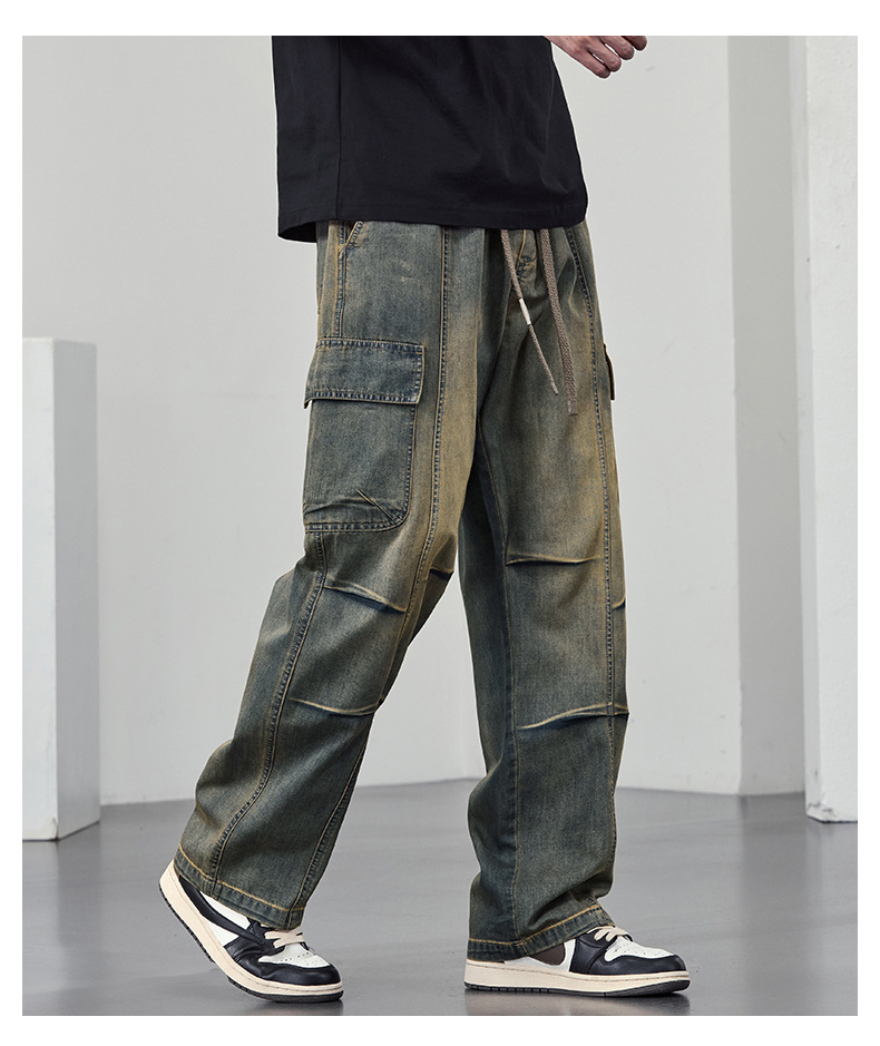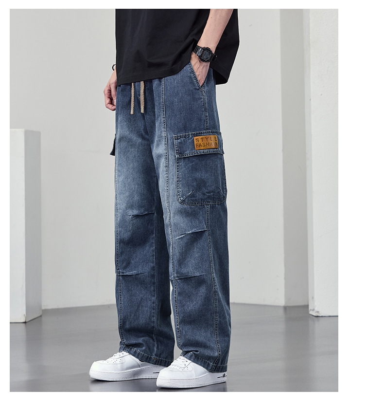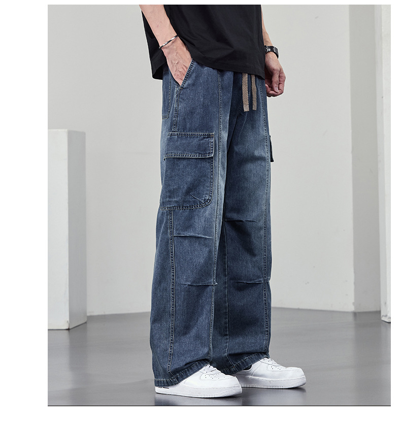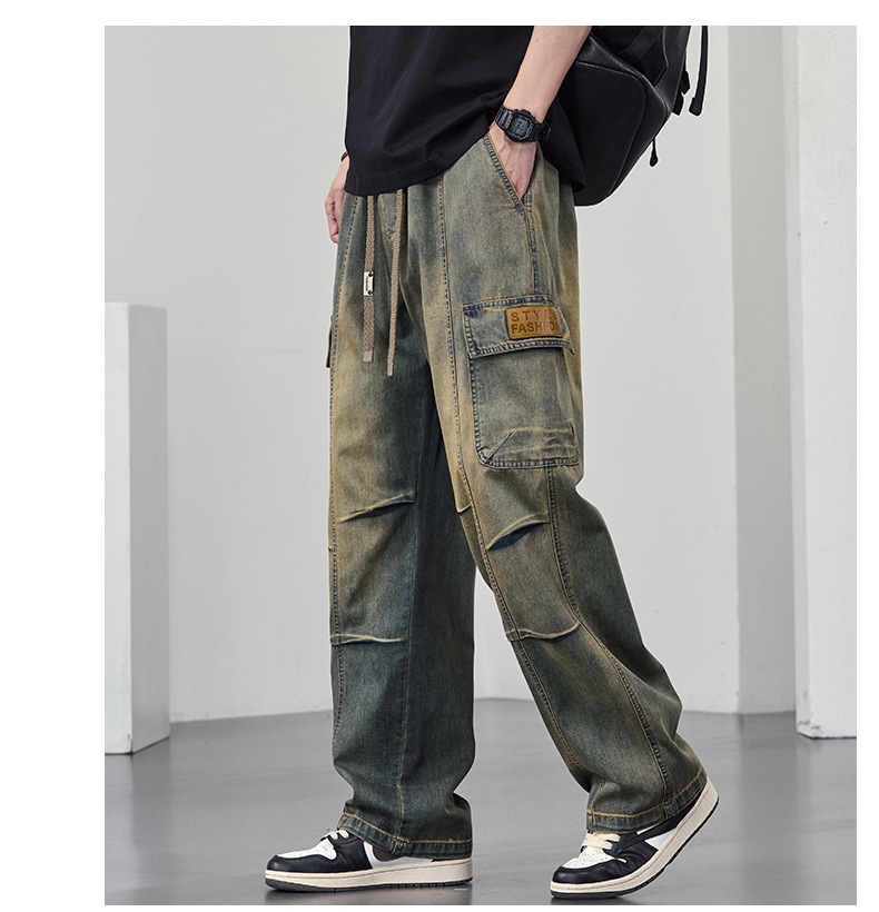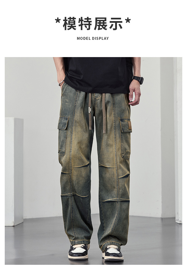 秋の工装ジーンズ男性ゆるいファッションブランド日系多ポケット直筒長ズボン復古大サイズズボン九分潮