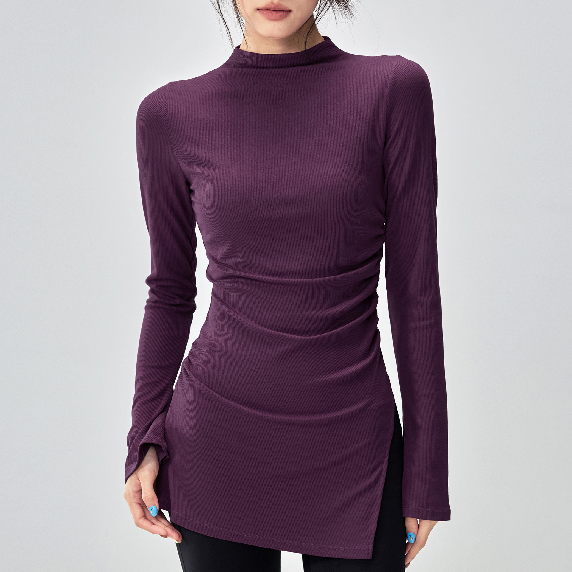 跨境罩衫普拉提训练上衣新半高领遮臀瑜伽服紧身运动喇叭长袖