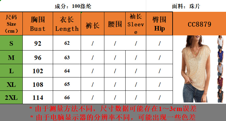 国境を越えた欧米の対外貿易女装2025アマゾン夏の新型女性vネックのスパンコール半袖上着のベスト女性