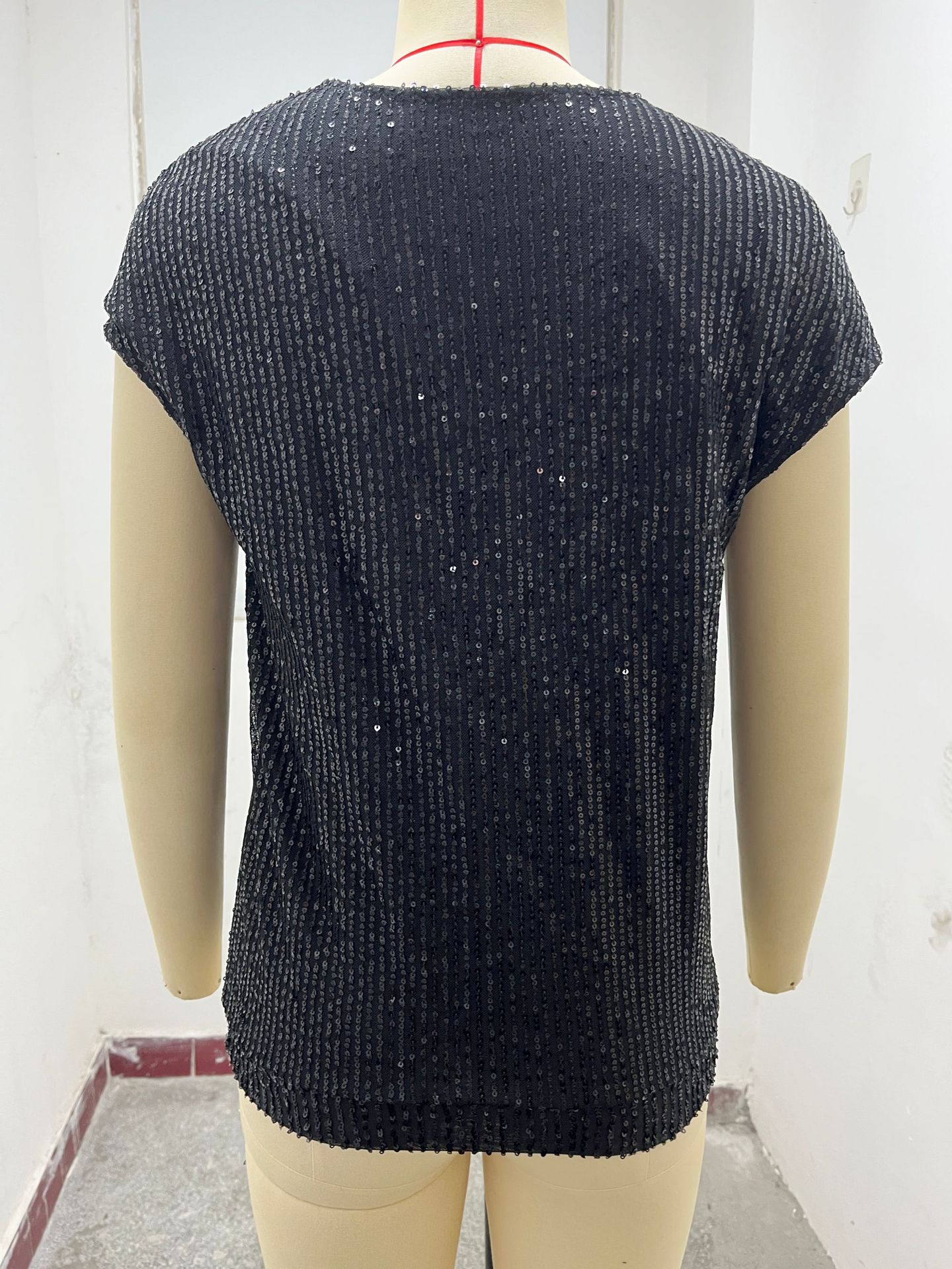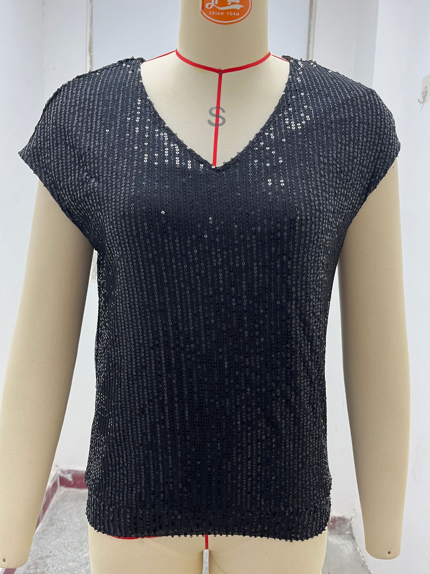 アマゾン2025欧米対外貿易クロスボーダー独立駅vネックスパンコール半袖女性キラキラベストパーティーシャツ