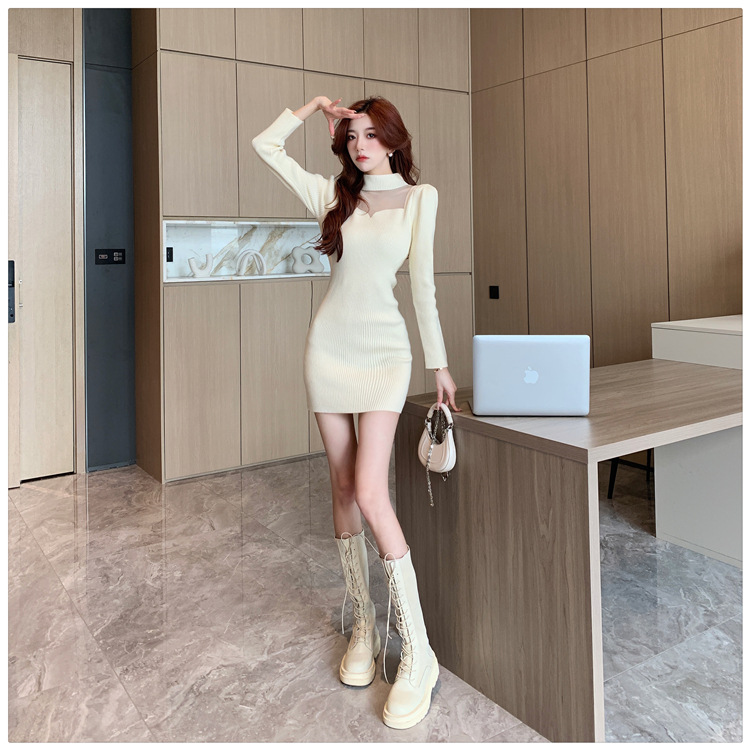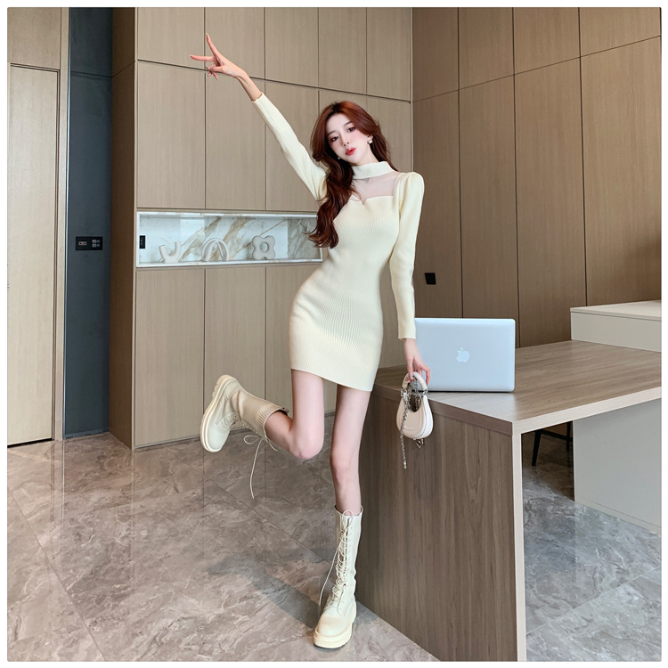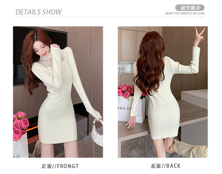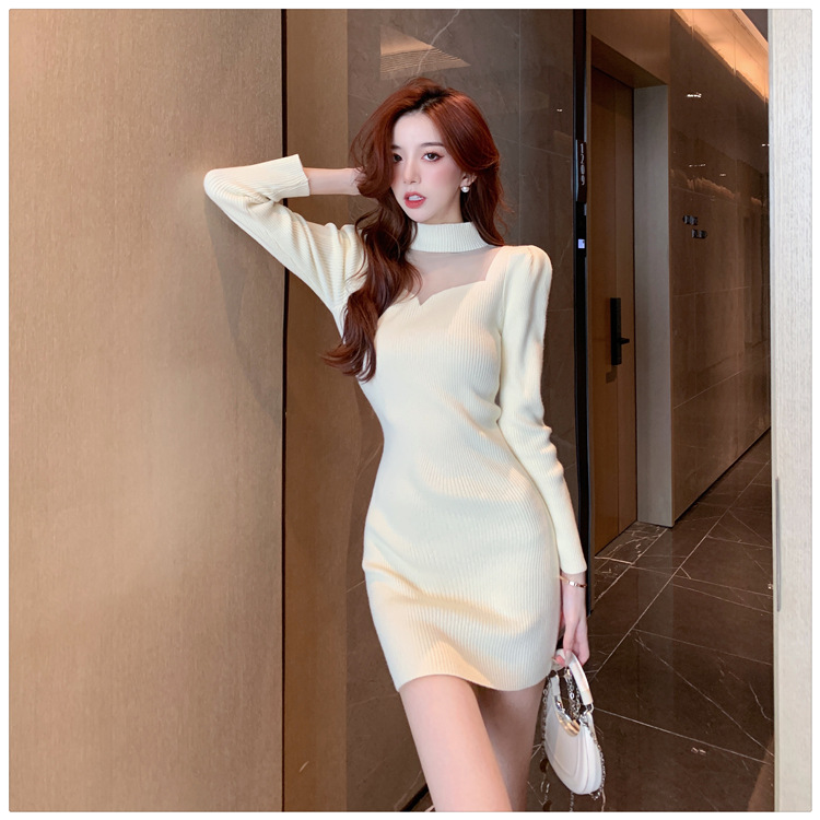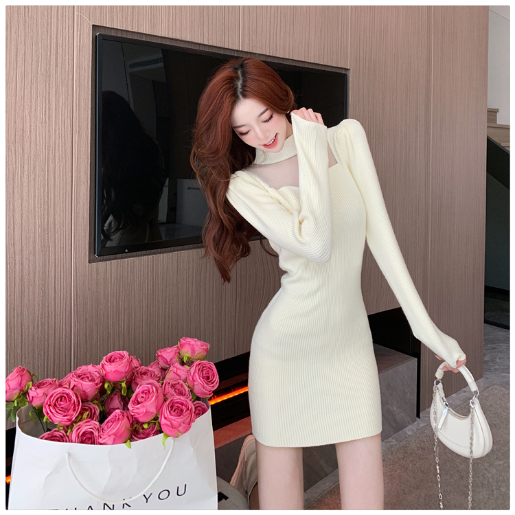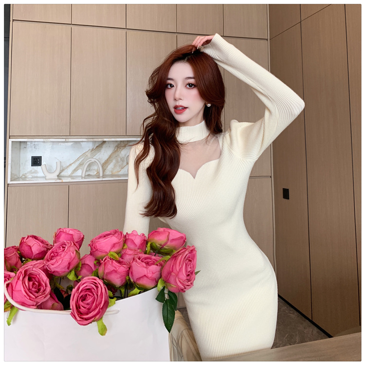 フランスの半高襟のニットのワンピースの女性2025春の新型の中にお尻のスカートの小さい背を包んでスカートを打ちます。