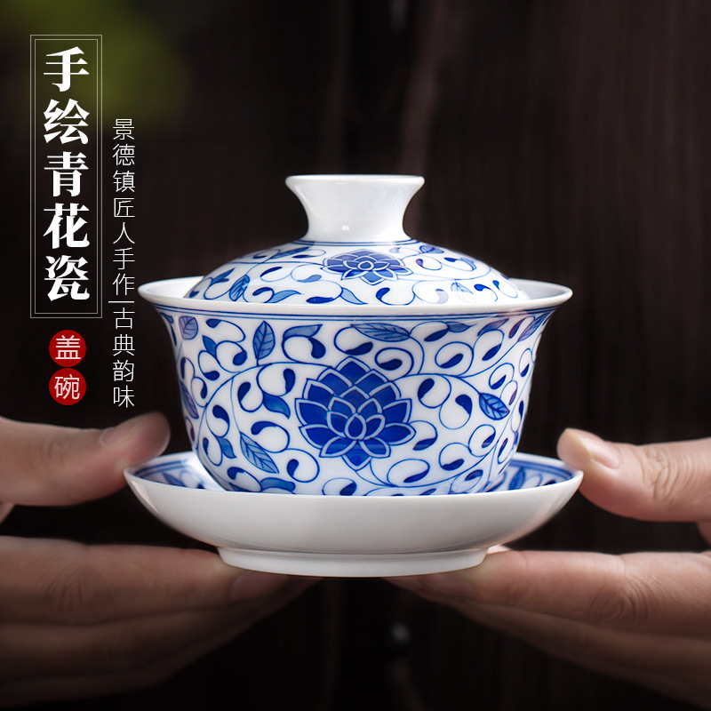 手描きの青花磁器の蓋の碗のお茶の杯の単一の景徳鎮の陶磁器の工夫の茶器はお茶を入れます。