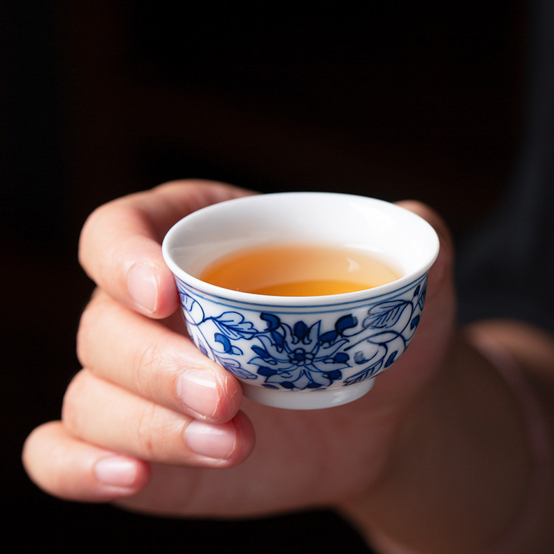 青花磁器の枝蓮の品茗杯の小さいお茶の杯景徳鎮の陶磁器の手描きの主人の杯の単杯の工夫の茶器の茶碗
