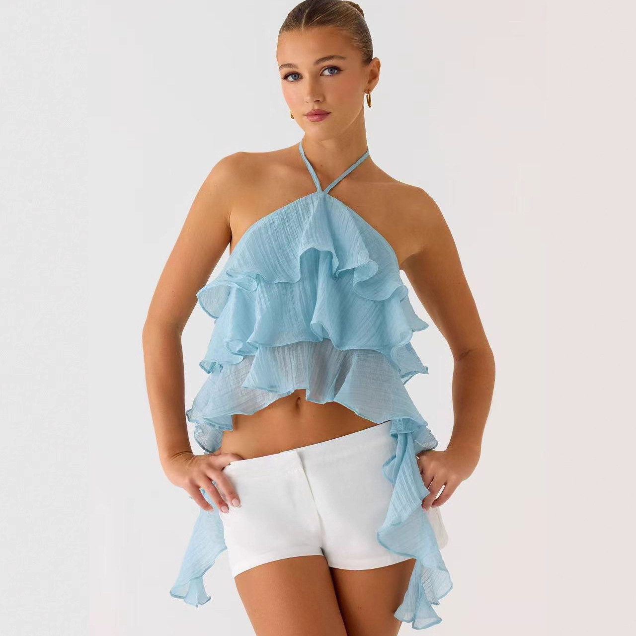 跨境欧美新款女装温柔风甜美挂脖系带露背叠层荷叶边飘带上衣