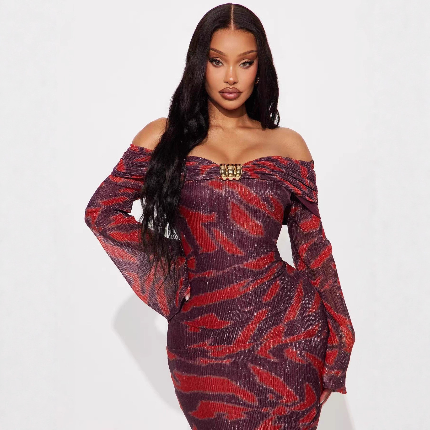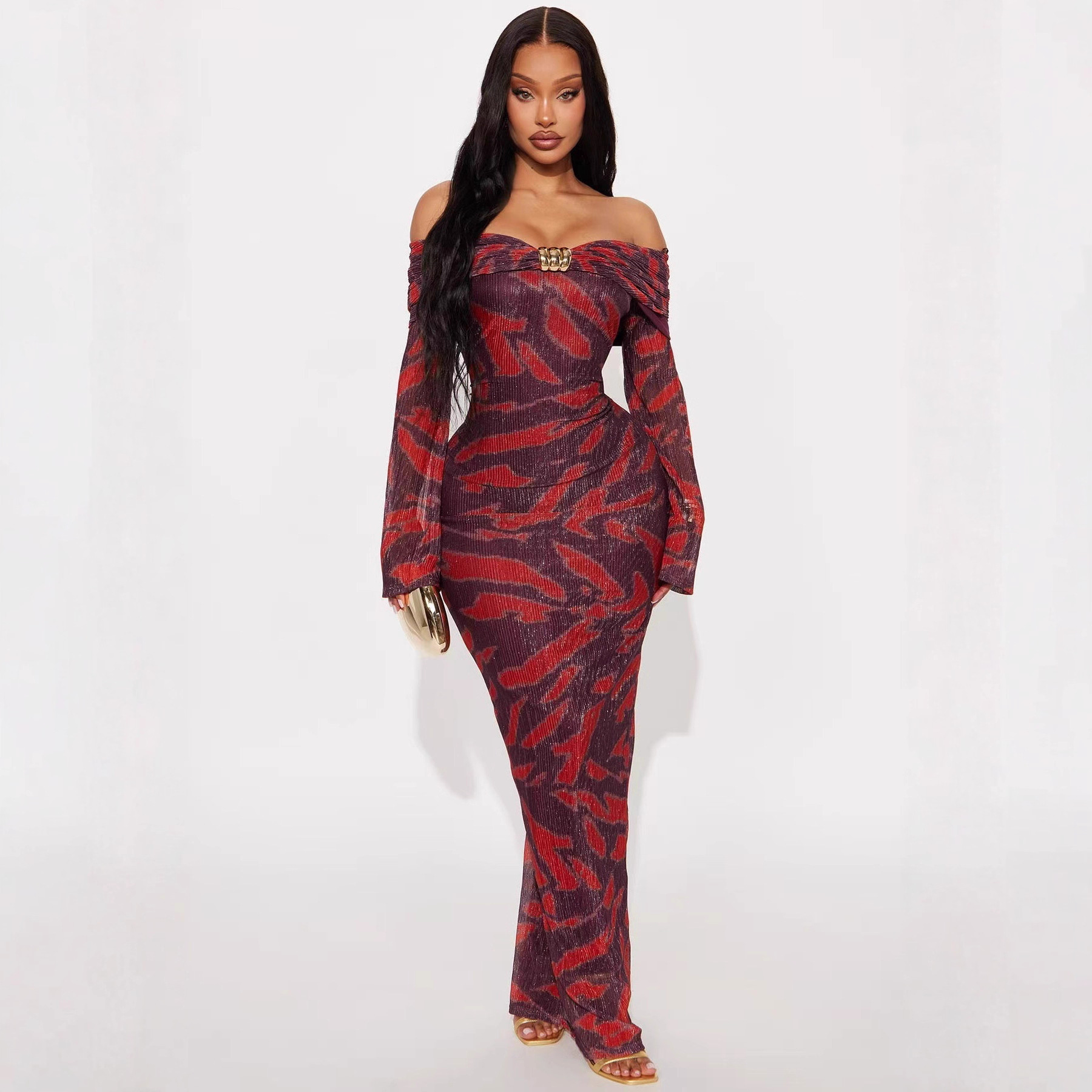 跨境欧美2025新款秋季女装时尚气质一字领印花提花修身长款连衣裙