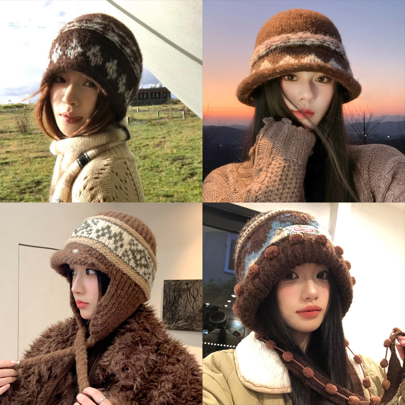 费尔岛风针织帽子女冬季保暖巴拉克拉法帽东北旅游防寒包头毛绒帽