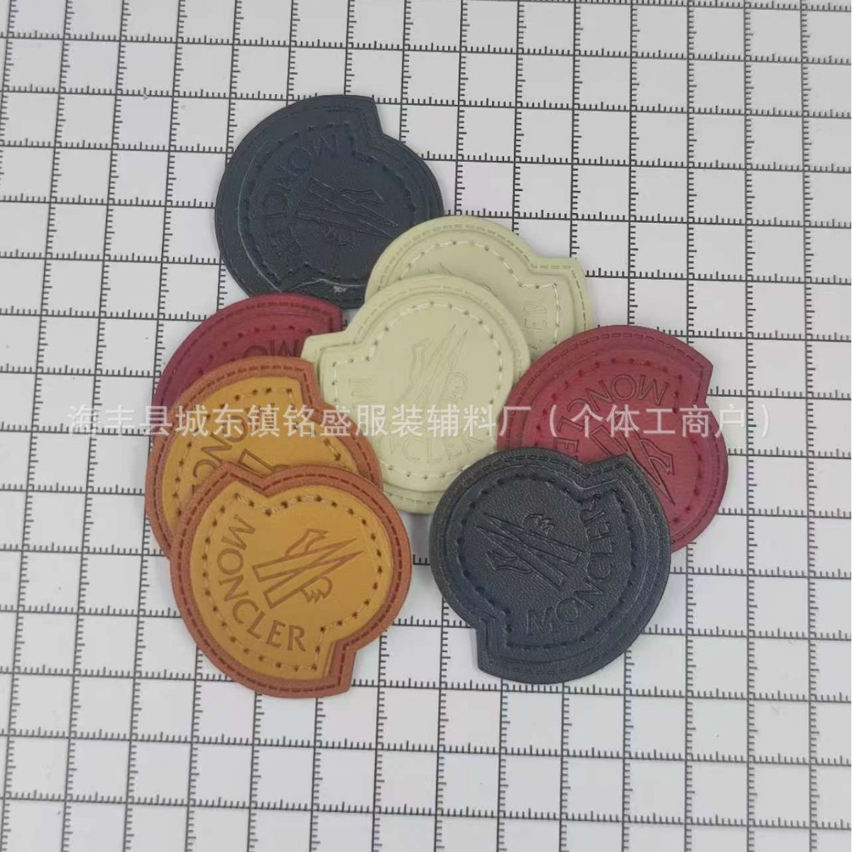 モンクレールの革ラベル、革製二重縫い帽子ラベル、衣料品ラベル、ズボンラベル、子供服アクセサリー、ダウンラベル、PU手作りラベル